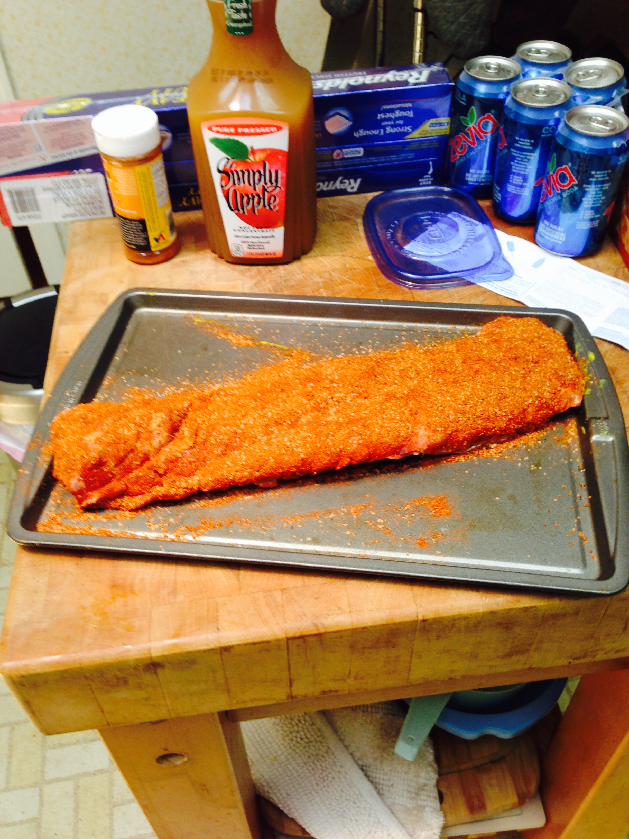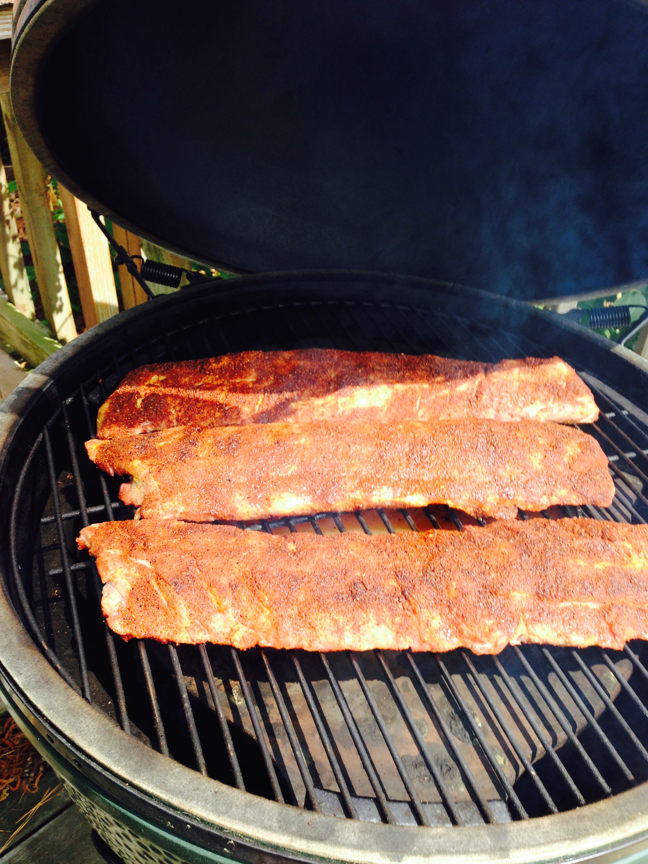 So after the flooding rains from yesterday, I've got 3 racks of ribs smoking for a family event tomorrow. 250 degrees, 2 apple & 1 cherry chunk. Ribs were prepped with French's Mustard and then Dizzy Dust as the rub choice. I've got a pan of apple juice for some flavored steam. I plan a 2.5 to 3 hour smoke then foil for an hour or so and finish with Sweet Baby Rays.