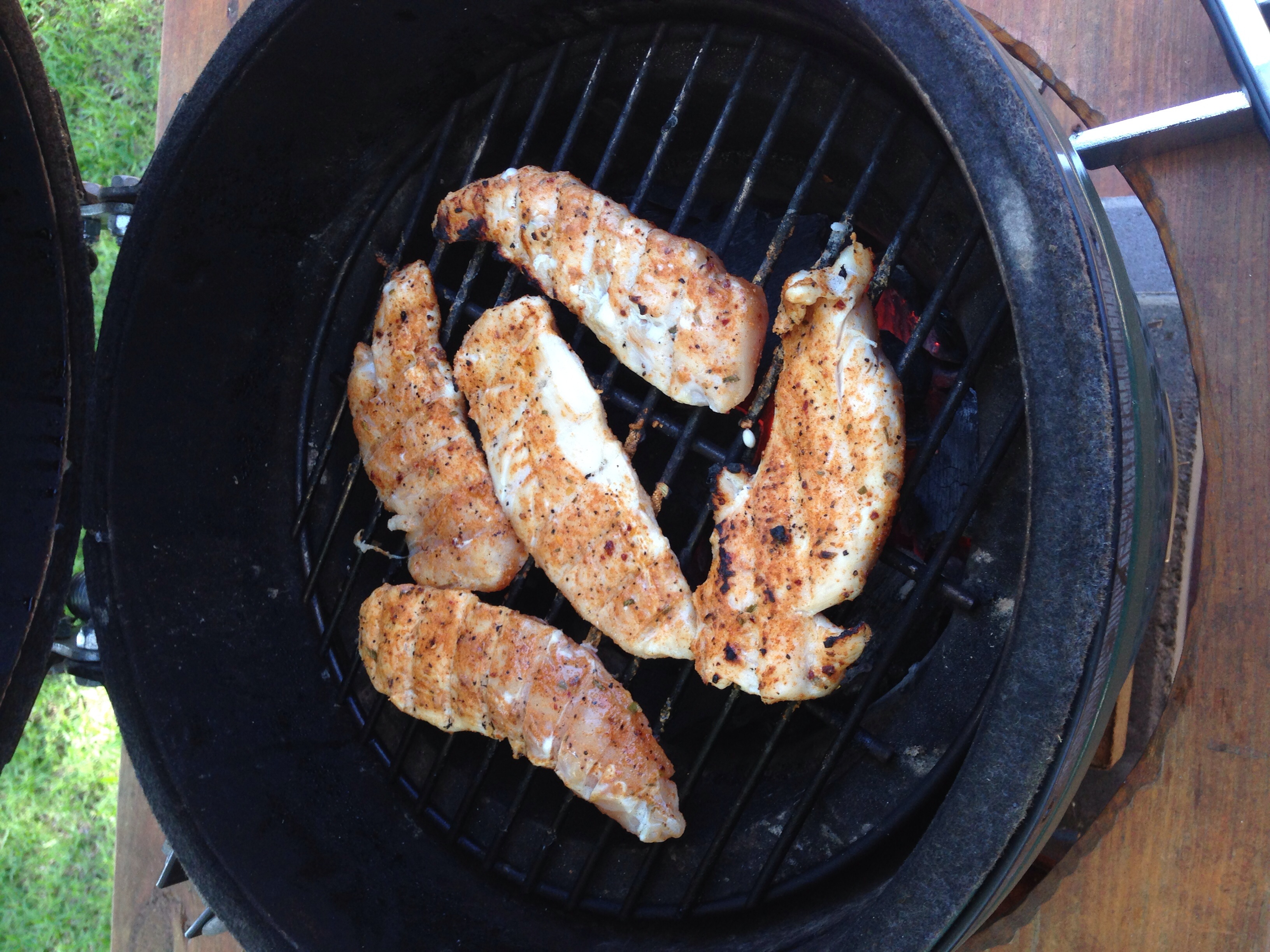 Cooked some strips on the small and then made a pizza. 500 on the large. Chicken rubbed with head country, light sauce, tons of thin sliced onions, a few dabs of cherry BBQ sauce from @Fred19Flintstone and topped with mozzarella.