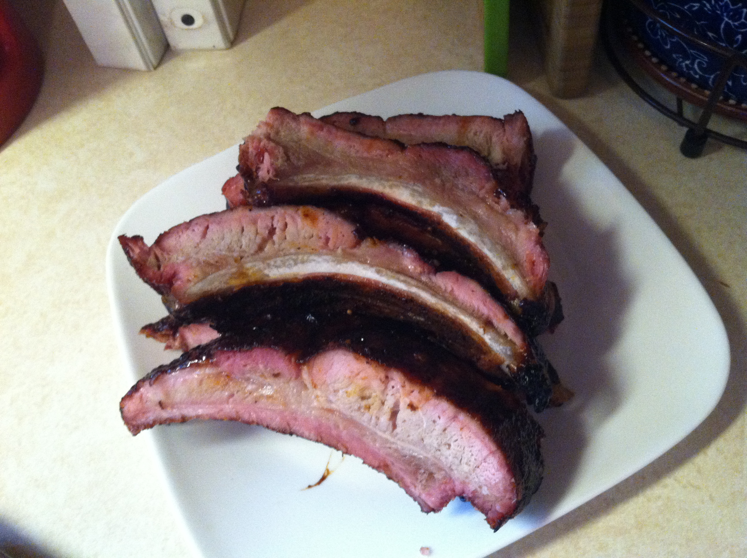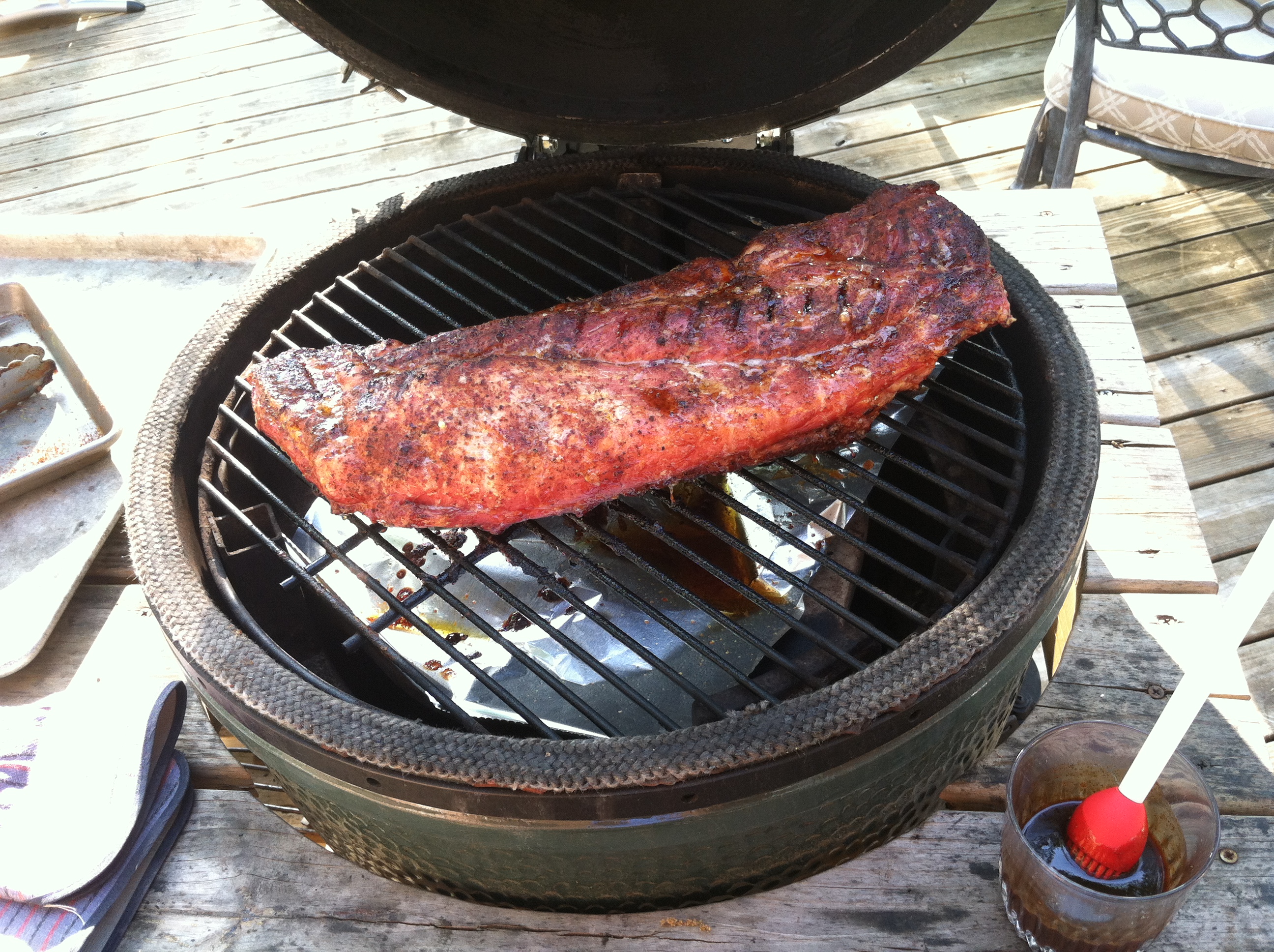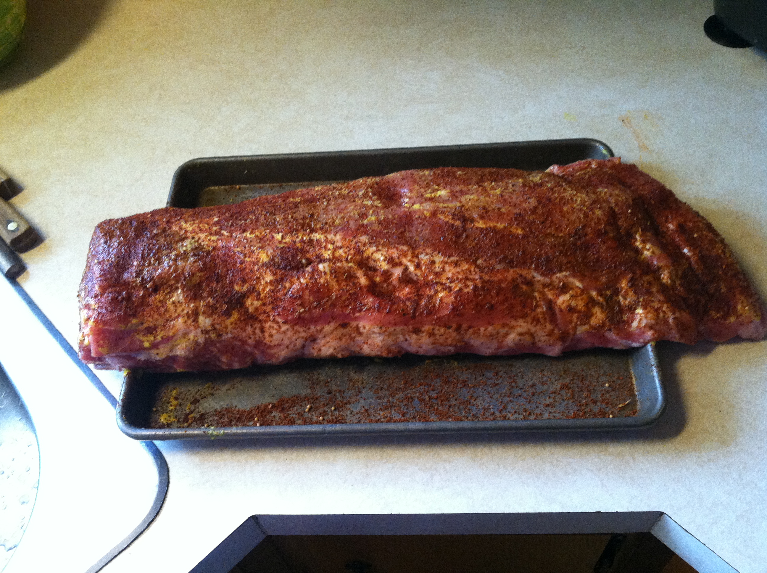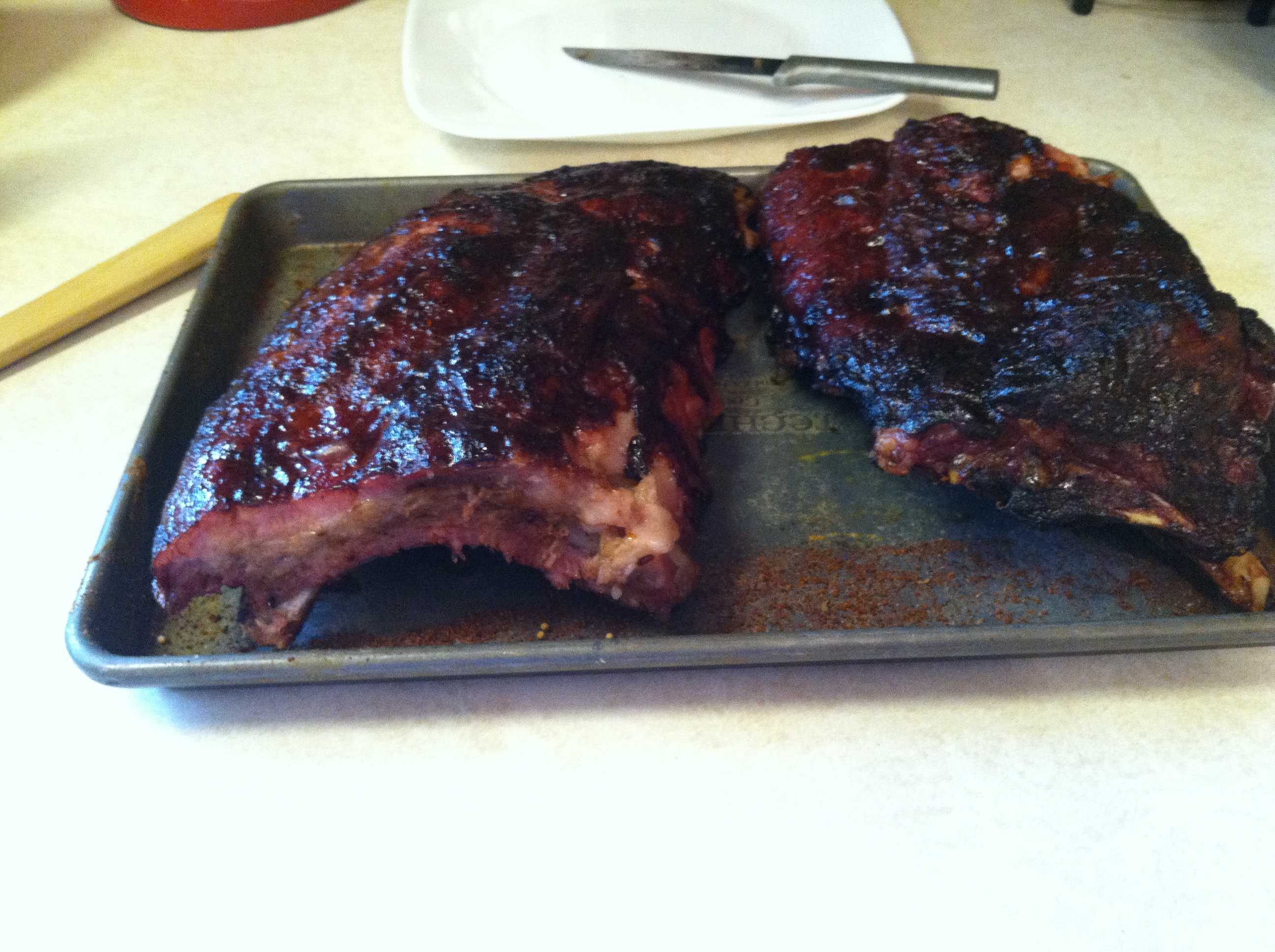5 lb. slab, indirect @ 350, local rub, sauced with Show-Me. Took a little over two hours to pass the bend test.