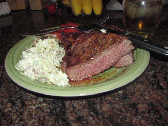 Ribeyes here too. Yours look much better than mine did. Cheaped out and got thinner ones than usual.-- won't make that mistake again. Tell us more about the roasted garlic???Slumming it in Aiken, SC.