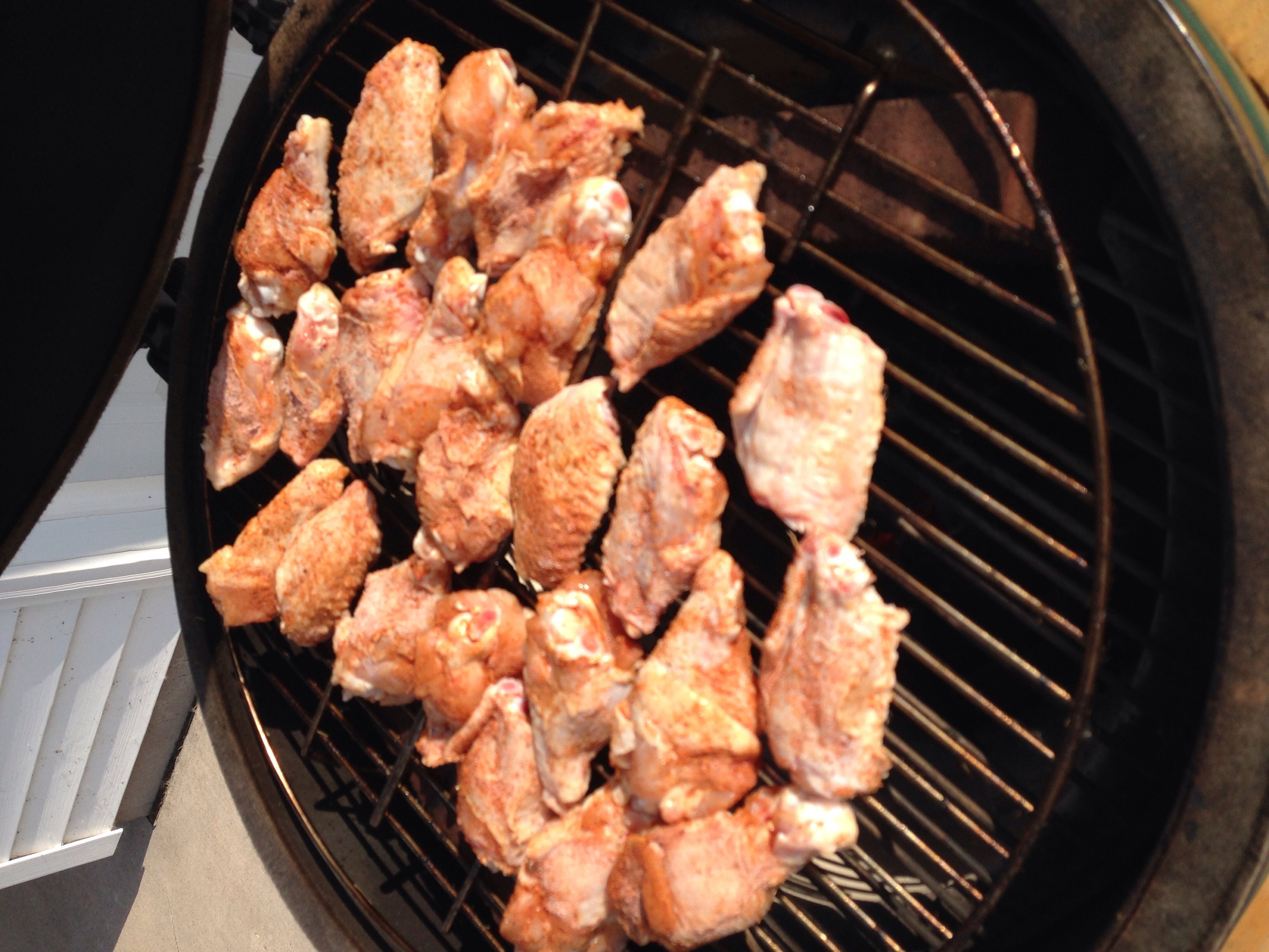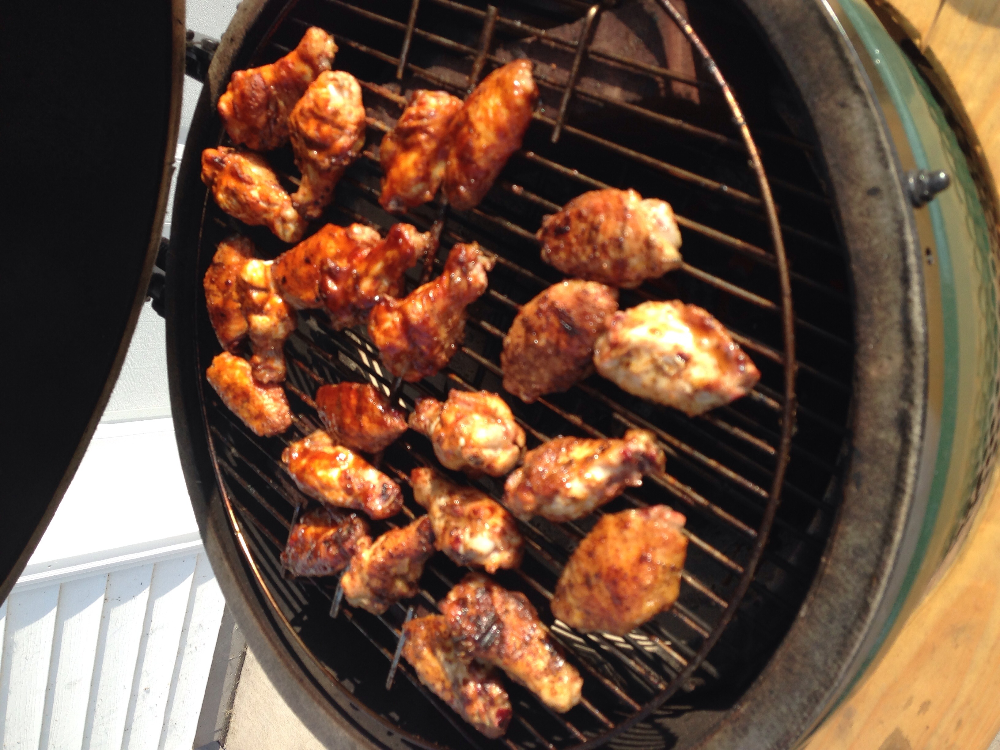 I've read multiple posts on here about wings and decided to try them out for myself for the first time tonight. I coated them with a 2:1 mix of Dizzy Dust and corn starch. Cooked at 375 raised direct for about 20 minutes then coated them with one of three sauces: Franks Hot Buffalo, lemon pepper, and my standard barbecue sauce. A few minutes to firm up the sauce and they were done.
