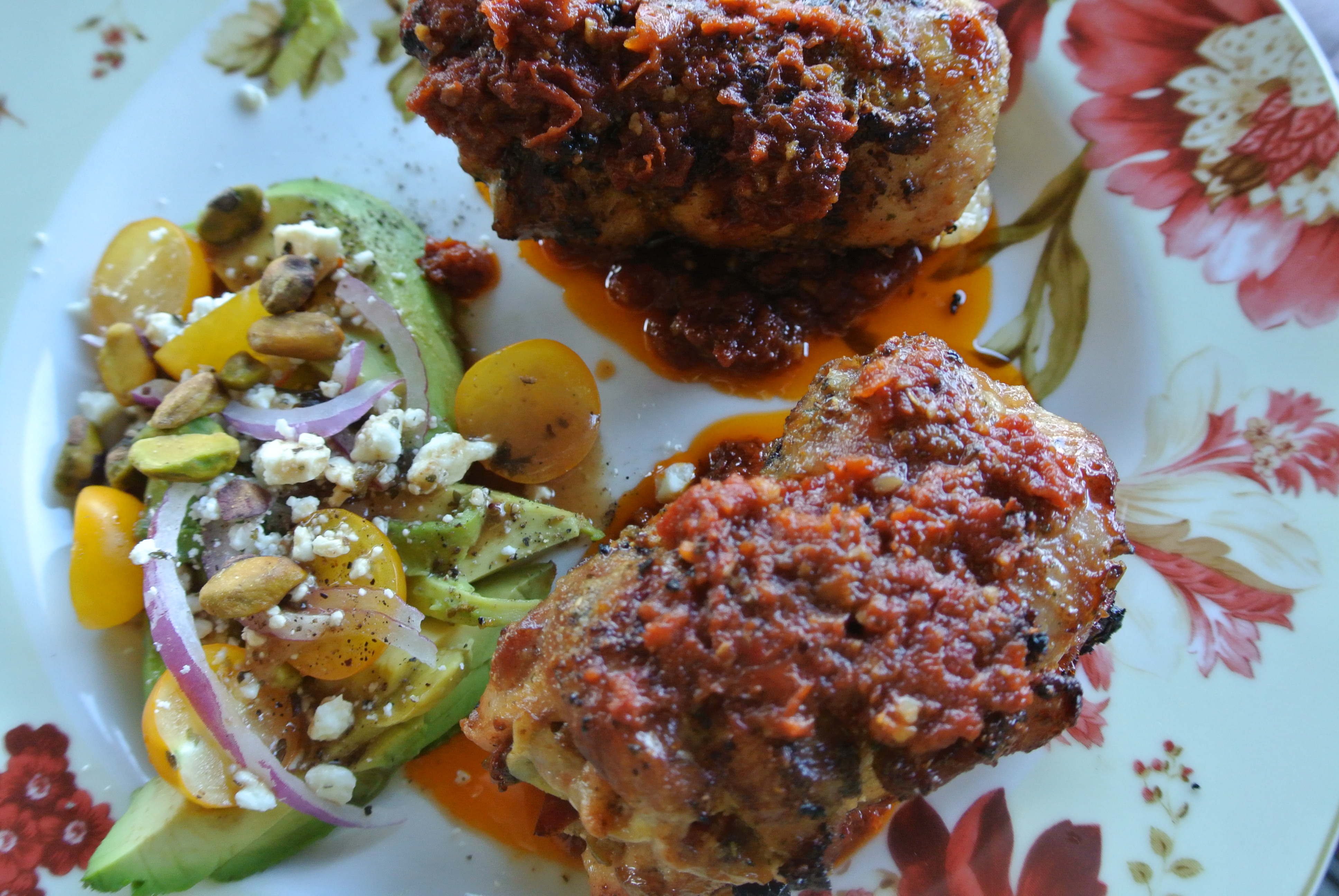 I was looking for a chicken thigh recipe with more of a "twang" than what I cooked this evening. (enough smokey good1 f1lavor but not any acid / tart / zing.)Came across this recipe.Could you give me an idea of what your ratios on your tapenade and sauce might be?>> Then made a tapenade of chopped mixed Greek olives, roasted red peppers, garlic, and olive oil.>> I made a simple sauce of sun dried tomatoes, olive oil, white wine, italian herbs, and garlic in the blender.