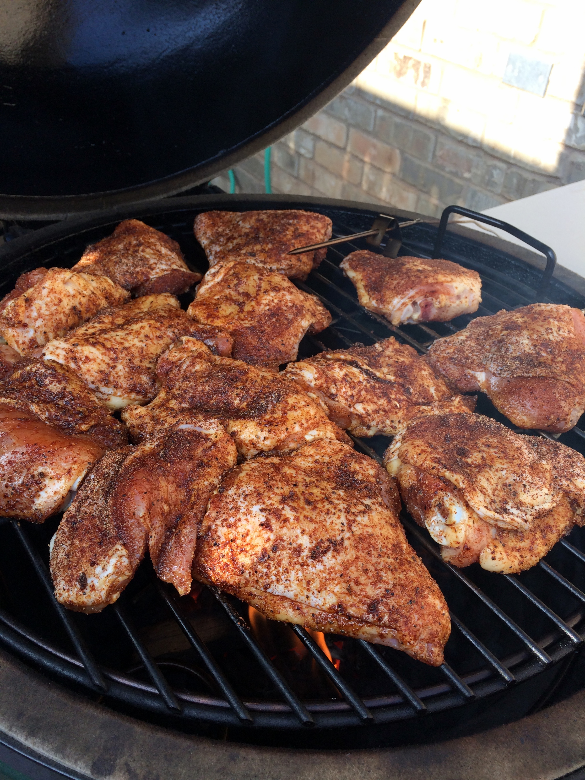 My wife intended to get boneless skinless chicken thighs at Sams but came home with bone-in mamma jammas. Whatever -- it was 8 bucks for 16 of them -- enough for 3 meals. That's what is so wonderful with the egg. you can make cheap pieces of meat into awesome meals.I ended up doing 375-400 driect until 165. End result? Delicious. If I have to make those chicken thighs for someone in the future I certainly wouldn't be embarrassed.On a side note -- I totally get letting thighs get to 185. While they were done at 165 I almost wished they had gone a little longer to firm up.On a side note to the side note -- Mickey's Coffee Rub is the most amazing stuff. It makes everything taste like meat candy. It's very unique and that's what makes it so great. I've never eaten anything that tastes like that -- sweet and aromatic and earthy.I don't have any finished pics but here they are on the egg. It was a great Saturday evening -- cooking on the egg and swilling cold Lone Stars from a trashy coozy after an afternoon of working in the yard on a landscaping project.WillLubbock, TXLarge BGE