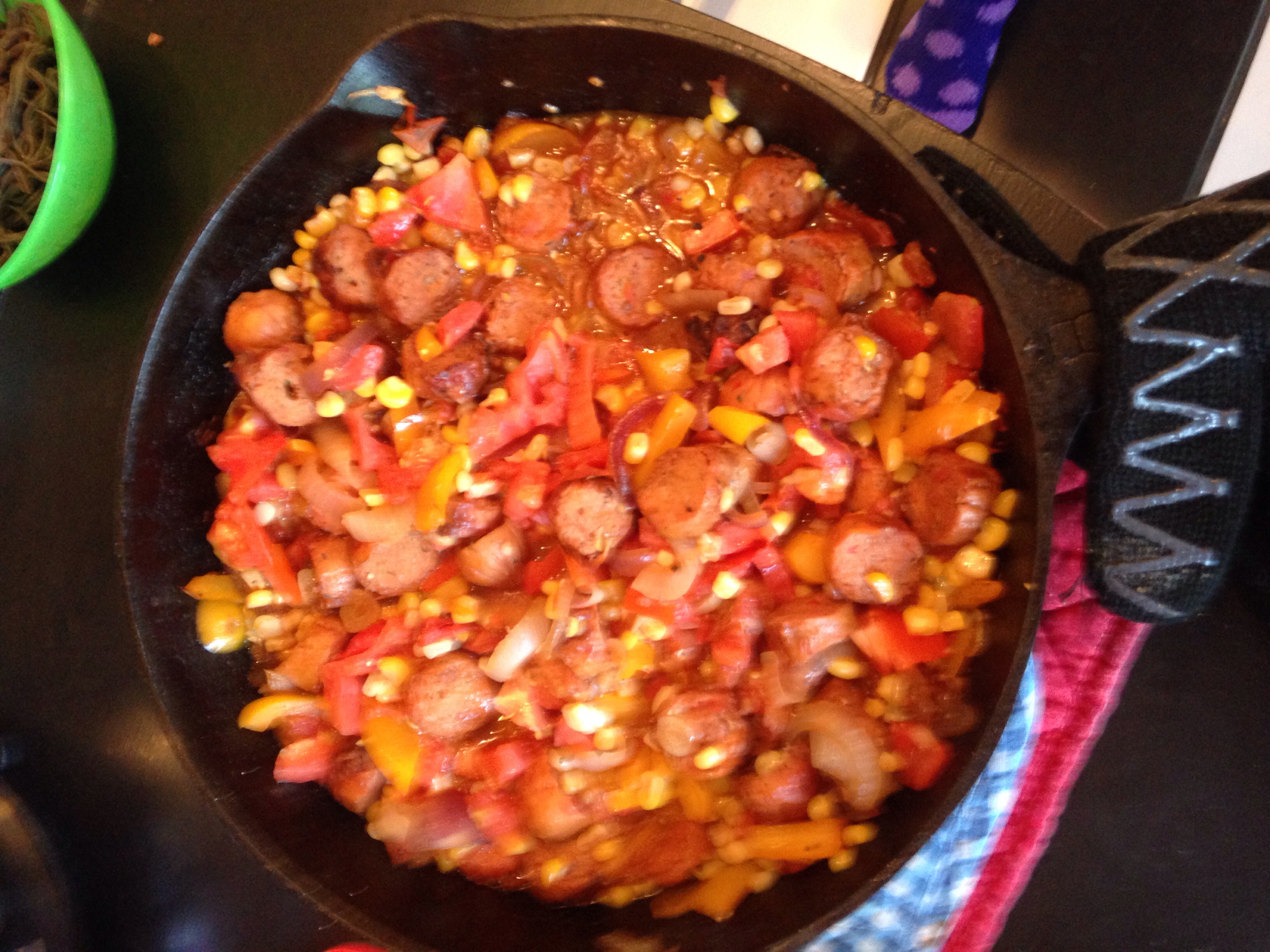 First I egged some chicken sausage while in a ci skillet I sautéed some onions peppers and garlic. Then added fresh tomatoes and corn plus some mole rub. Served it over some black bean pasta and finally topped with white cheddar. It was very delicious.