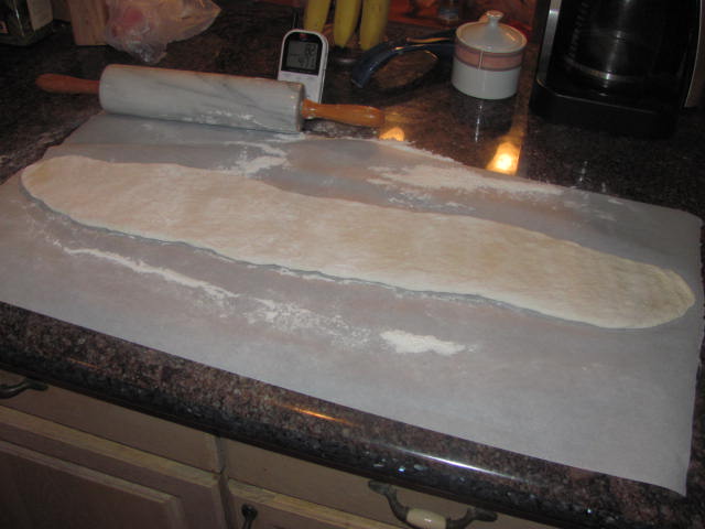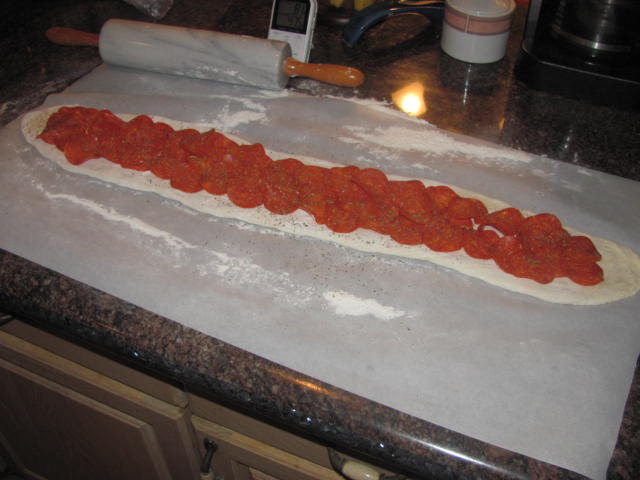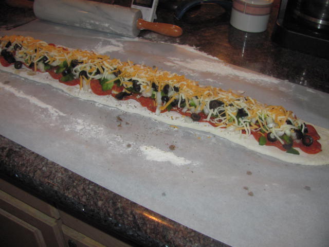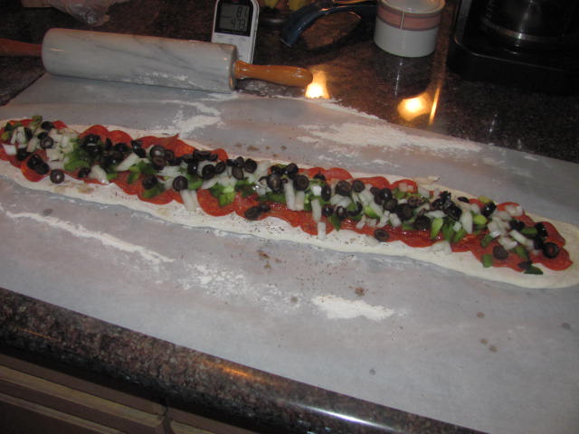 Used my hands to make a long dough roll.  Use a roller to flatten it, then filled it, then used my hands to....overlap and create the roll, then made the snail.  Cooks just like a pizza, but that is a lot of food in a compact package.  I think I will try making halfsies of it next time.