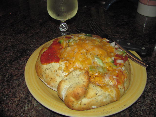 A lot more stuffing than the first, which balance the bread to stuffing better.  This is a whole pizza on one plate so it is a big meal.  You eat it by cutting around the spiral.  This would be fun for a meal for two, but it is actually enough for more than that.  Maybe with experience I will be able to make tighter rolls to make smaller snails.