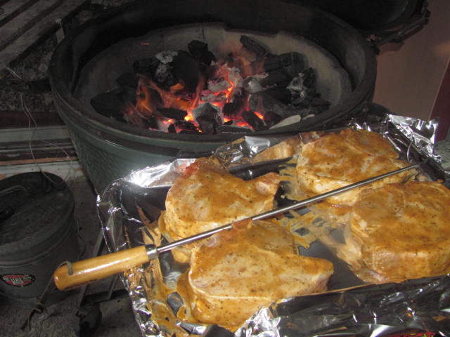 Dichickos Garlic marinated thick pork chops done caveman style.  Potatoes and sauteed asparagus sides.