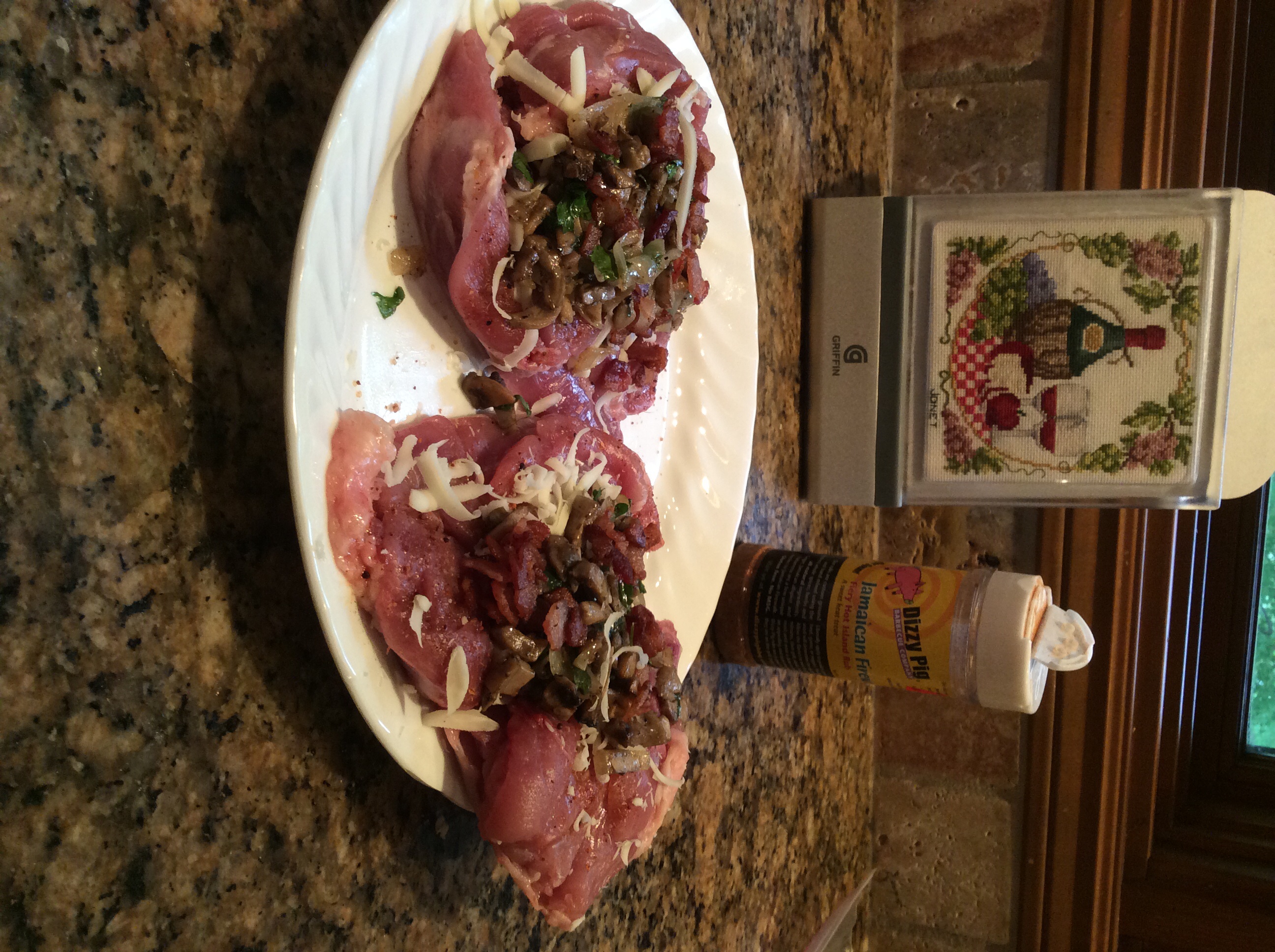 This has been done before but I thought I would give it a try. Deboned the thighs, made a stuffing with mushrooms, bacon, onions, parsley, mozzarella and white wine. About 450 indirect until 180 with the thermopen. I seasoned them with Jamaican firewalk and basted with butter. Served with fresh local corn, roasted red peppers and broccoli. Nice pino Grigio and I'm happy!