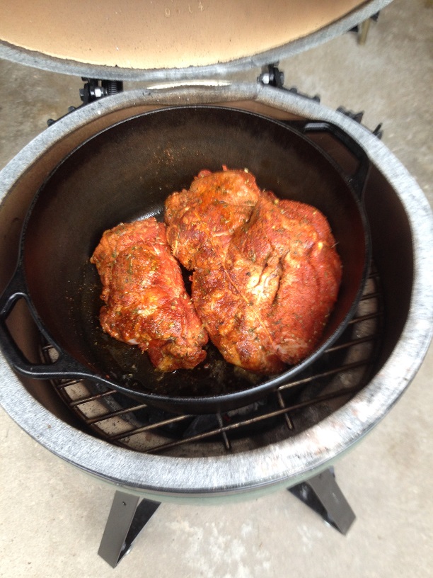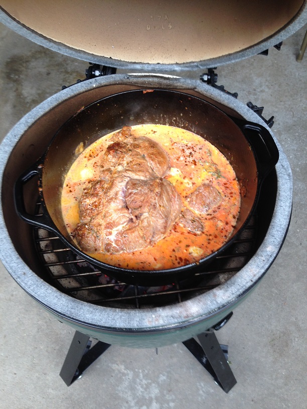 One conclusion I drew, I don't think I will do my DO sear on the egg in the future. All that time with the lid open gets a roaring fire going, and it took a lot of time to get the temp back down to the 300 I wanted. When the pork is done, I will reduce the sauce either on the stove or a side burner, and will grill some zucchini slices for a side. I'll try to get another pic or so towards the end f the cook.