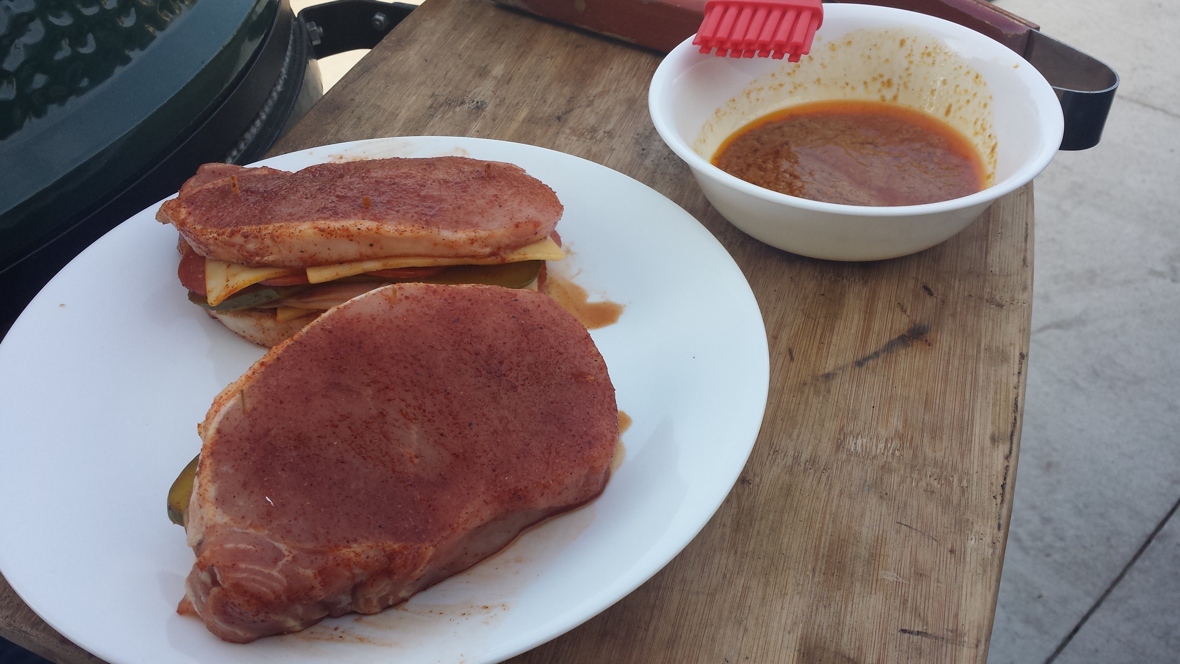 I started out with seasoning the chops with Dip Stix - Mary's Favorite rub. (Highly recommend this rub) The pork chops were stuffed with: Muenster cheese, pepperoni slices, ham, sandwich pickle, and coated with a mustard glaze on the outside.