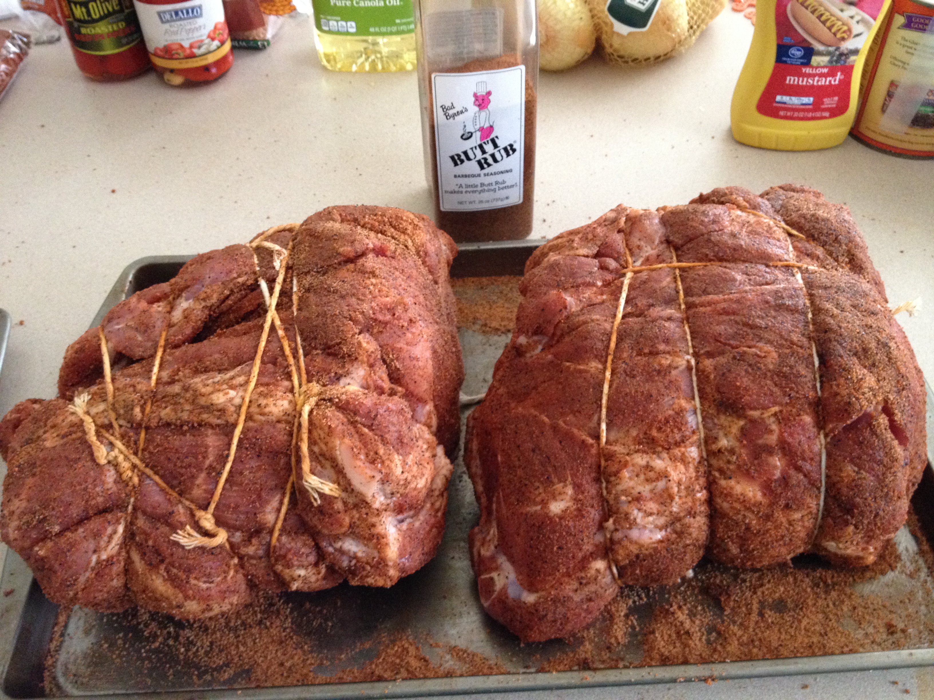 Trying a new to me method on the butts. I cit a few slits and put a little Bad Byron's in, then butcher-twined them back shut.