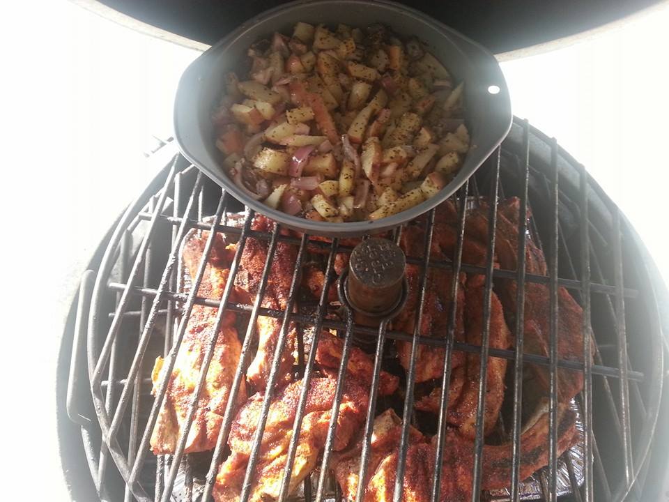 @ladeback69 that Kansas City rub is very good and leaves a nice crust on the ribs. Here you go, Rubbed in mustard and a heavy coating of Kansas City rub cooked 250* indirect for an hour, pulled and went direct. Cranked it up and then threw them back on for 3 minutes a side. Pulled and let stand while the potatoes and onions were finishing up. Hope it meets up to your standards...The Gator Nation, Central FloridaLARGE & MINI Life is good...GO GATORS!!!