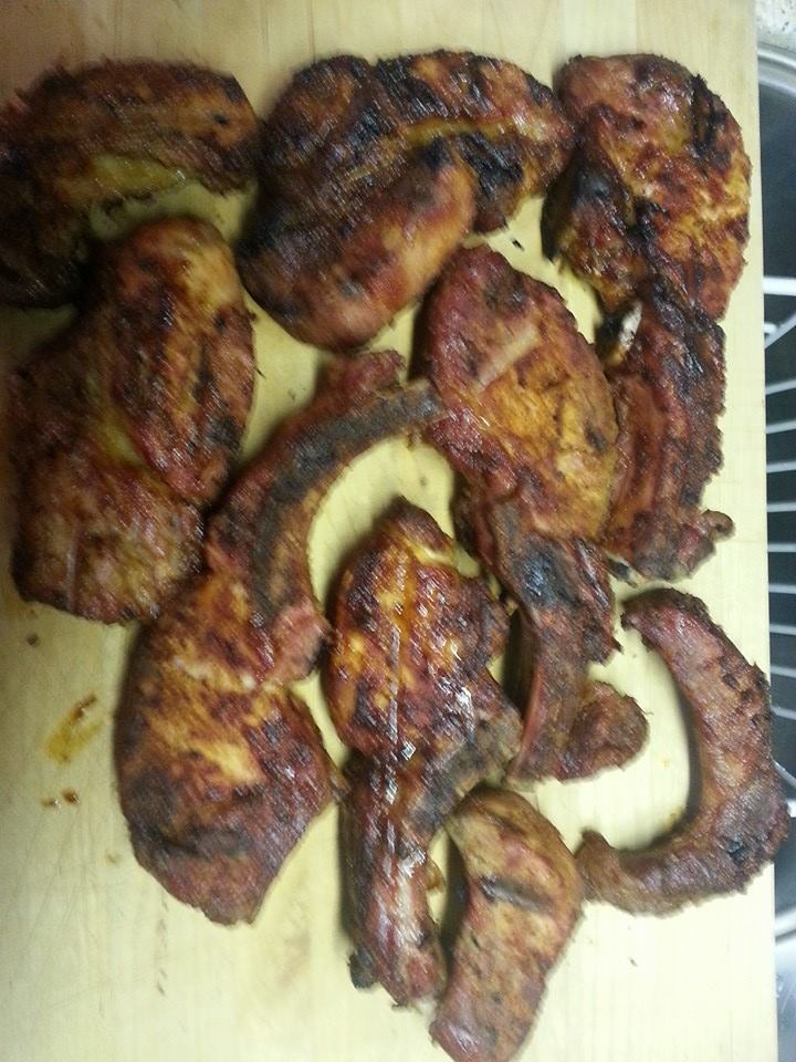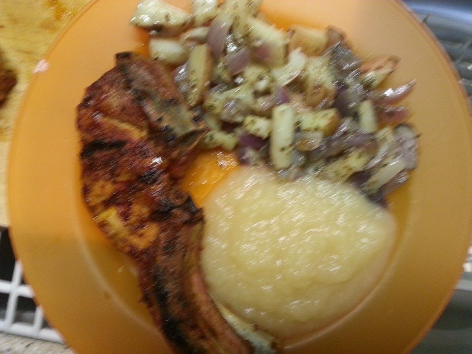 Looks tasty. Pork chops and apple sauce.XL, WSM, Coleman Road Trip Gas GrillKansas City, Mo.