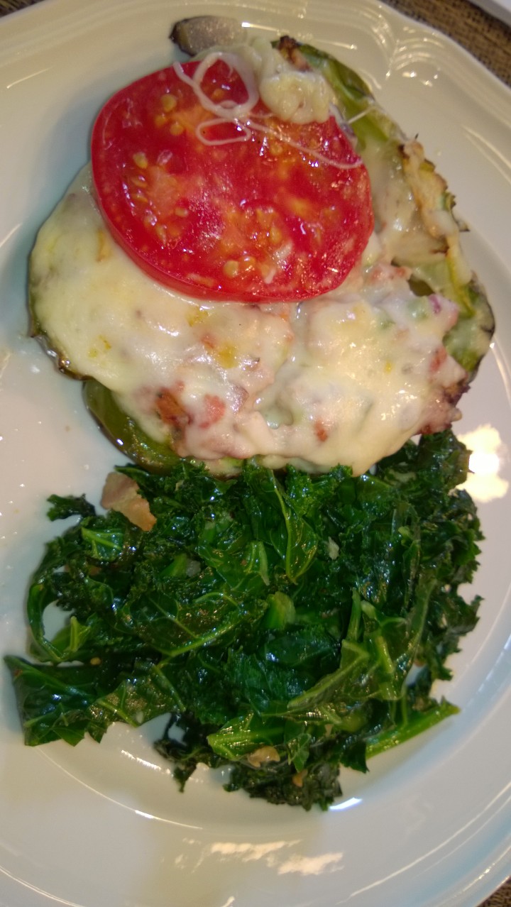 Needed to eat a bit lighter last night. Ground some turkey thighs and seasoned with Dijon mustard, Worcestershire sauce, S&P, garlic etc.. 375 degrees for 30 minutes, added Mozzarella and a mater from the garden and went 10 minutes longer. Served with sautéed Kale.