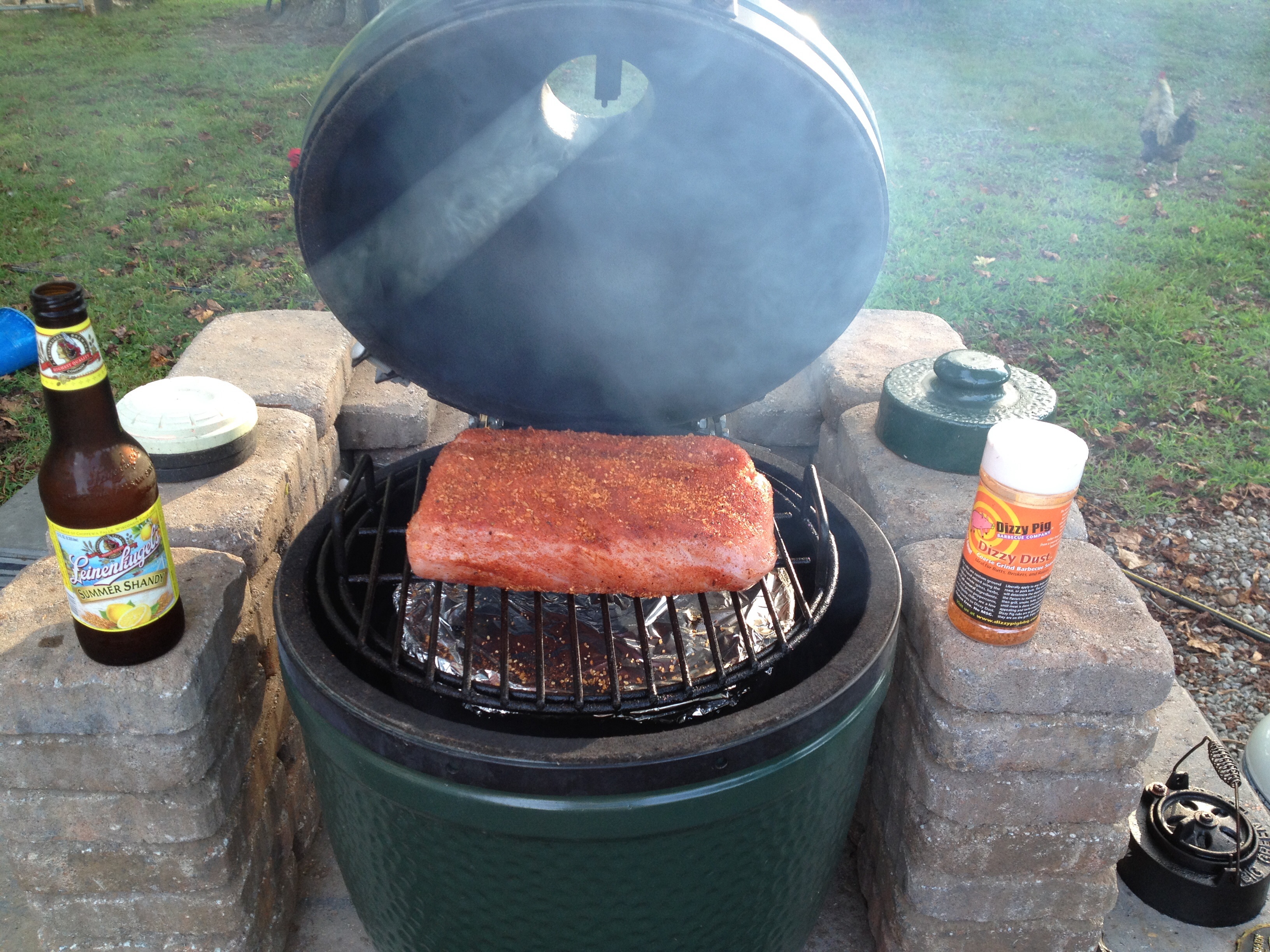 Nothing special here. Just a pork loin rubbed with Dizzy Dust coarse. The loin is almost 4 pounds. I'm going 350 indirect with hickory and pecan for smoke. I plan to smother in apple butter for the last 10-15 minutes.