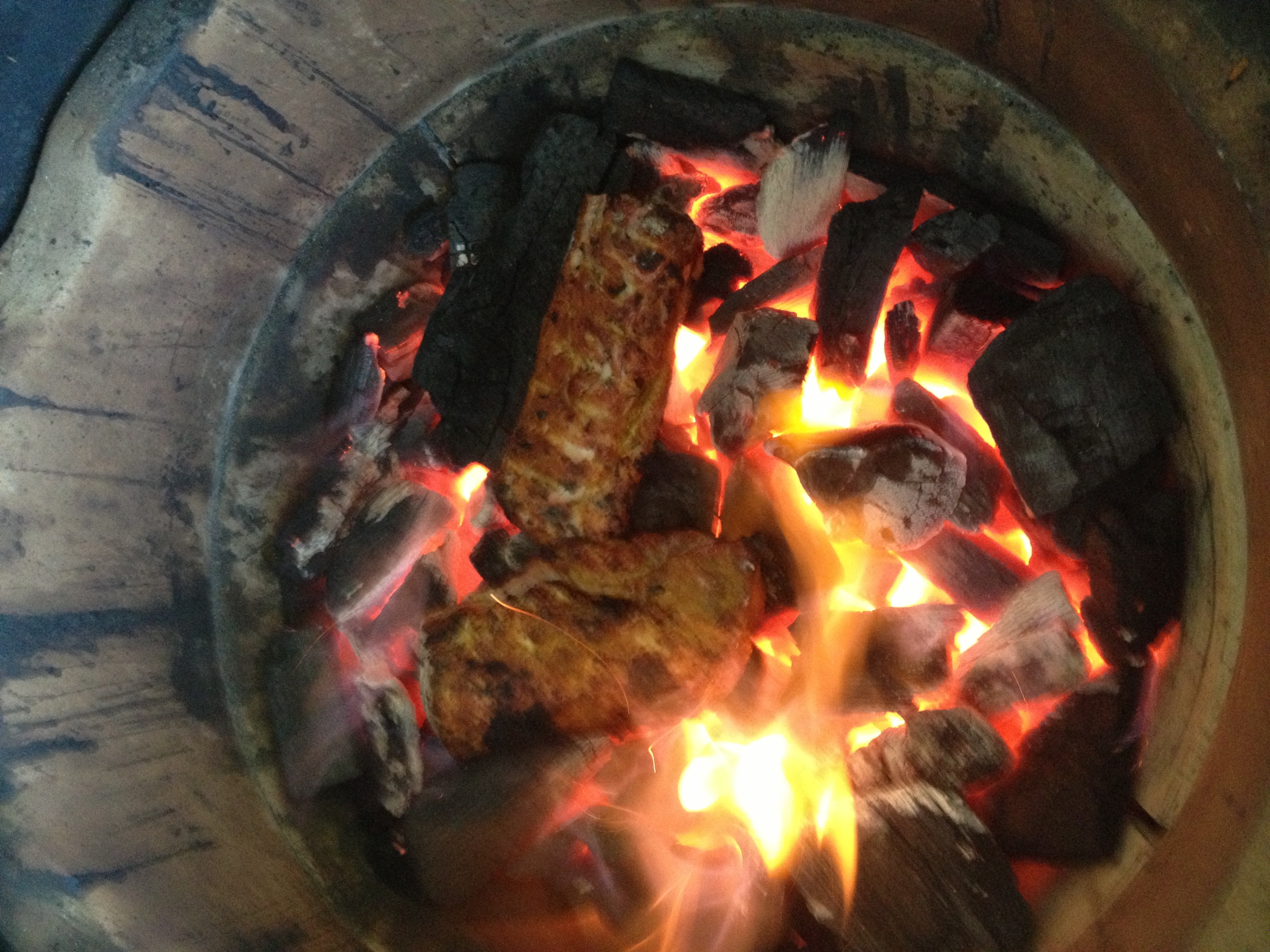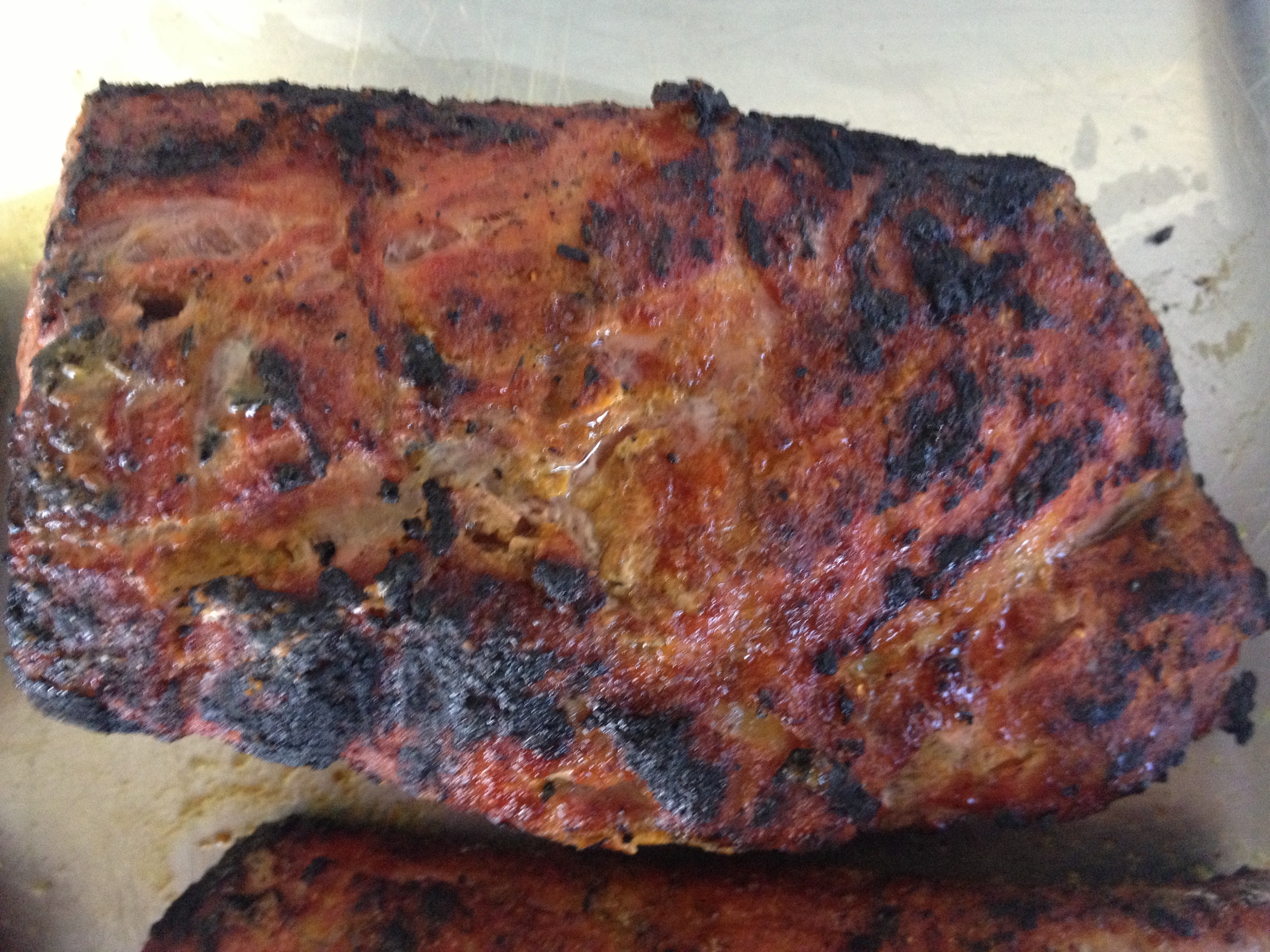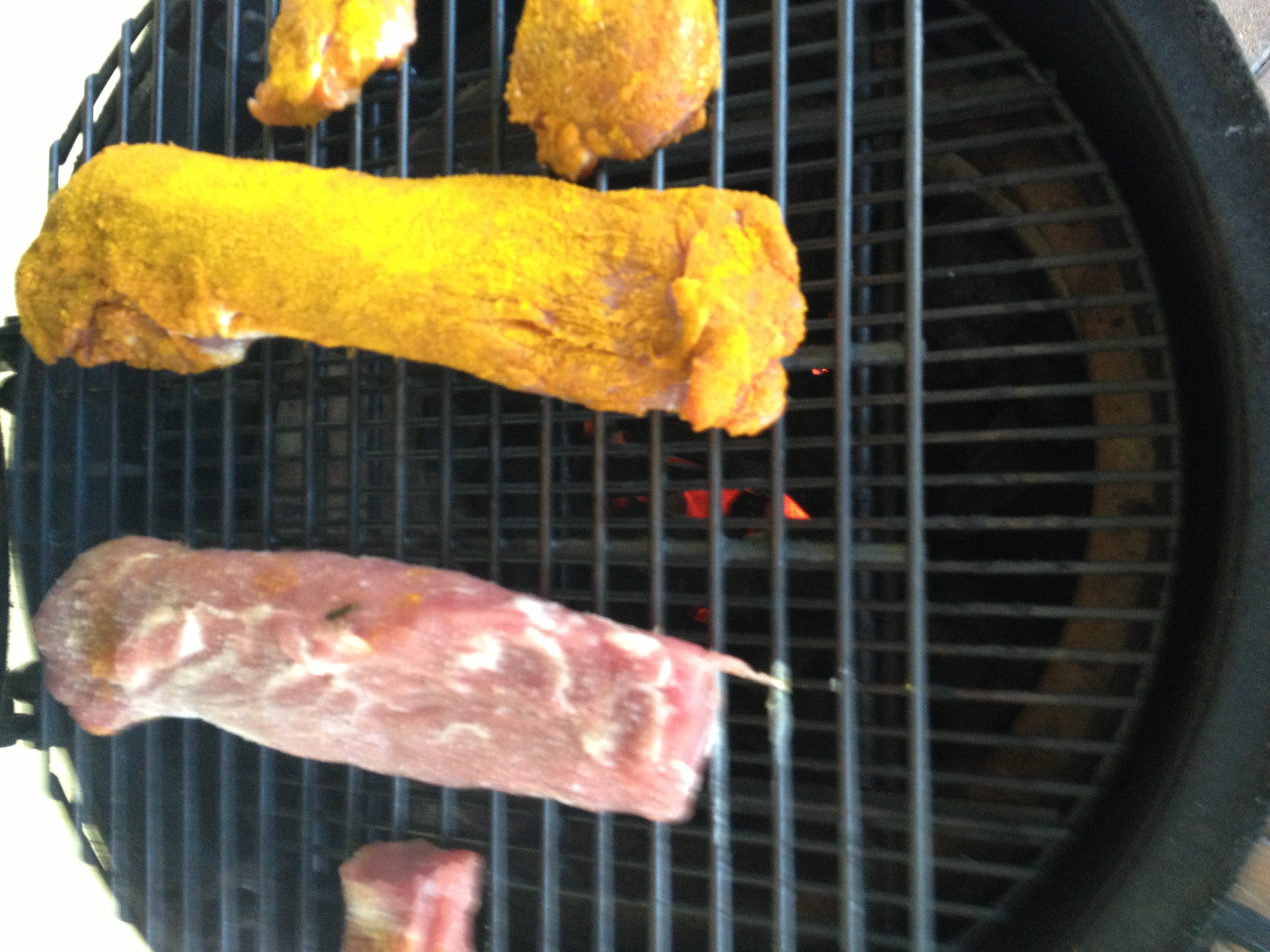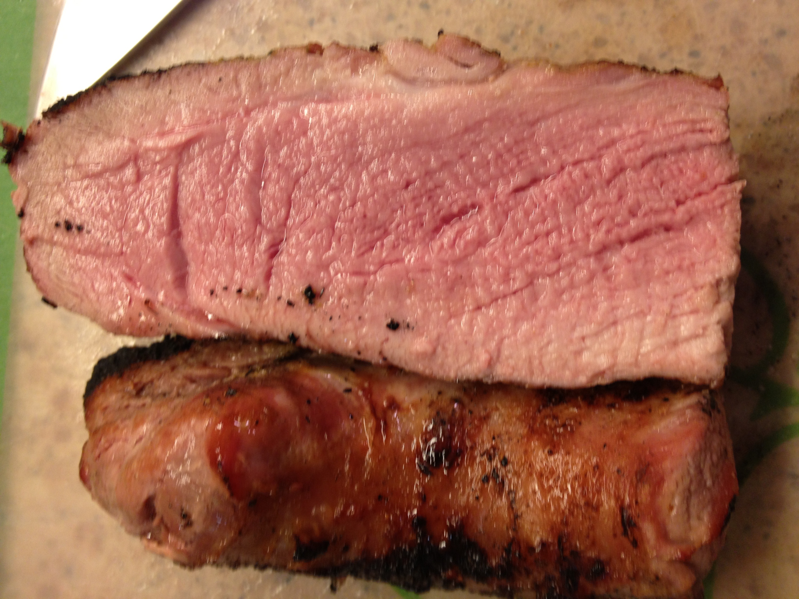 We make these regularly, normally I pull them when the very center or thickest cross section hits 135F or so and they coast up to 140F and over a little depending. The rest of the PT IT is higher, depending on contour. Even when you go over 140F a little they are still pinkish. Either way, that's the way we like 'em, uh huh, uh huh!In this case the caveman sear added, well, sear, a thin layer of bark and flavor. Started with the PTs having reached around 117F IT raised direct, pulled them off, set them aside and played around with the 'nuggets' that were trimmed off first, to see how they would cook up and how much lump dust they would get on them, since this was our first attempt to join the caveman fraternity.Didn't notice any lump residue so set that 'fear' aside. But, the PTs are relatively lean and so by the time the first PT was searing noticed that just leaving it for a minute or two on each side resulted in hot spots (blackening). The second PT was rotated and moved around every 15-20 seconds or so to get a more uniform sear. Not sure what other improvements are needed next time. Maybe start the sear at 10 degrees lower IT and sear a little longer. Or, maybe no changes!