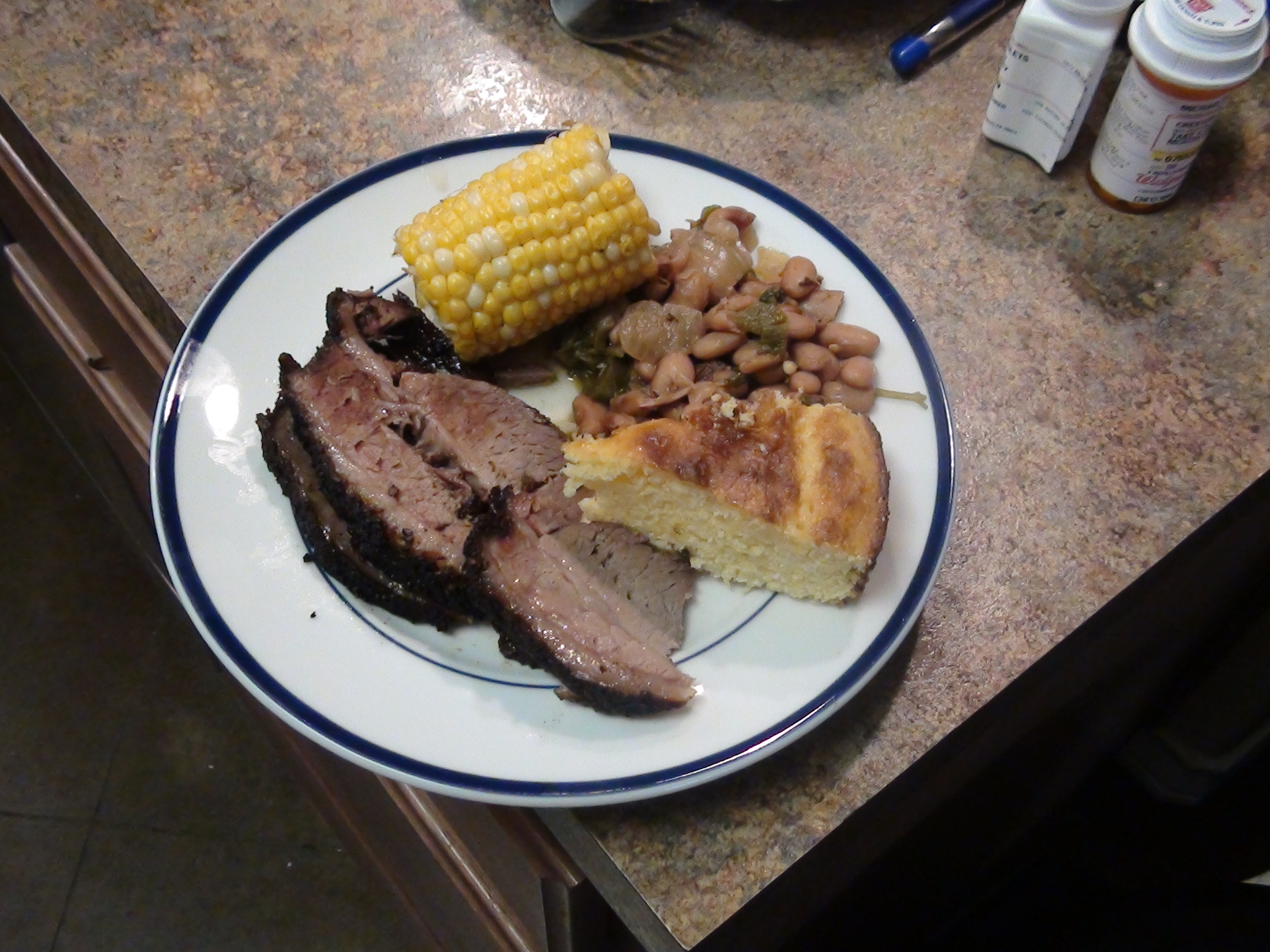 I decided to cook, a brisket, this weekend and since the egg was hot, some skillet corn bread, beans, on the stove and I currently have a peach cobbler on the egg. Here is the result.