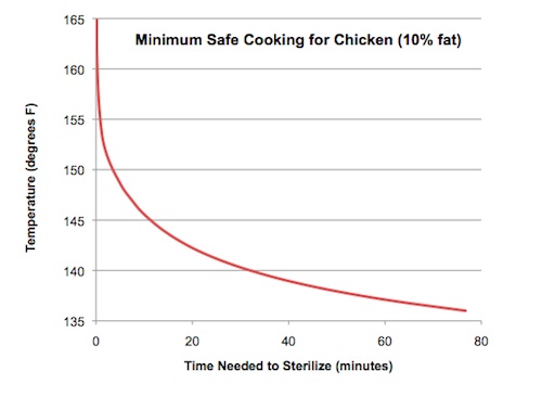 Chart for chicken - sous vide based shows the relationship between time and temp for food to be cooked and hence safe.What this says is if chicken with 10% fat can be held with an internal temp of 137º for one hour, it is cooked and safe to eat - the texture might turn you off, but it would be safe.@gdenby - great summary.Delta B.C. - Whiskey and steak, because no good story ever started with someone having a salad!
