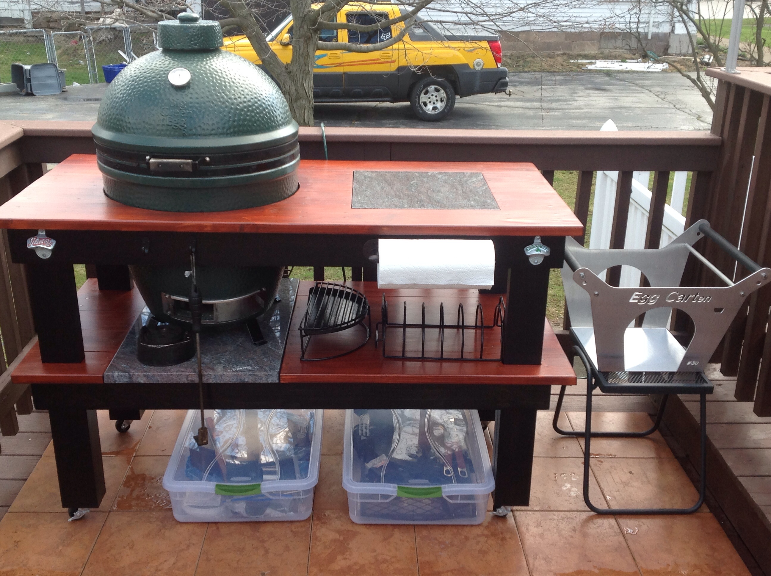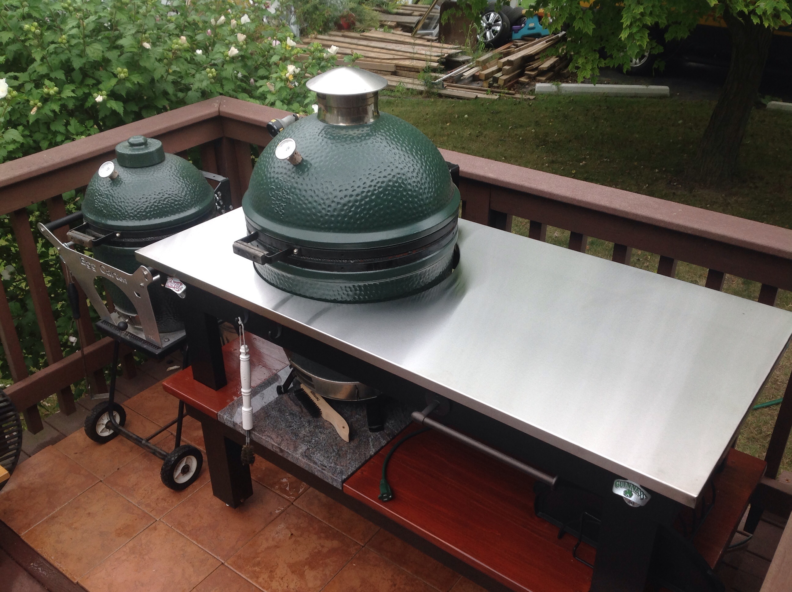 You have the upscale version of my 8 year old cedar table, recently upgraded....:). I had the stainless top fabricated locally too, out of some 13 gauge 304 SS. Easy to care for, certainly. I do keep a big poly cutting board close by to protect my knives since I do a lot of prep work on that surface. The SS cleans up great with a little BarKeeper's friend. Note that the ceramics of a plate setter or pizza stone can scratch the SS pretty deep. I periodically have taken an orbital sander to it with some 400/800/1200 wet/dry sandpaper...then a little fine Scotchbrite. Polishes the thing right up.Jackh said:I cut the hole my pine table top to small when I built it. Decided to cut a larger hole have a stainless top made by an Amish sheet metal shop. I had a piece of granite ordered. After two months and still not done I canceled it. The stainless was completed in two days.