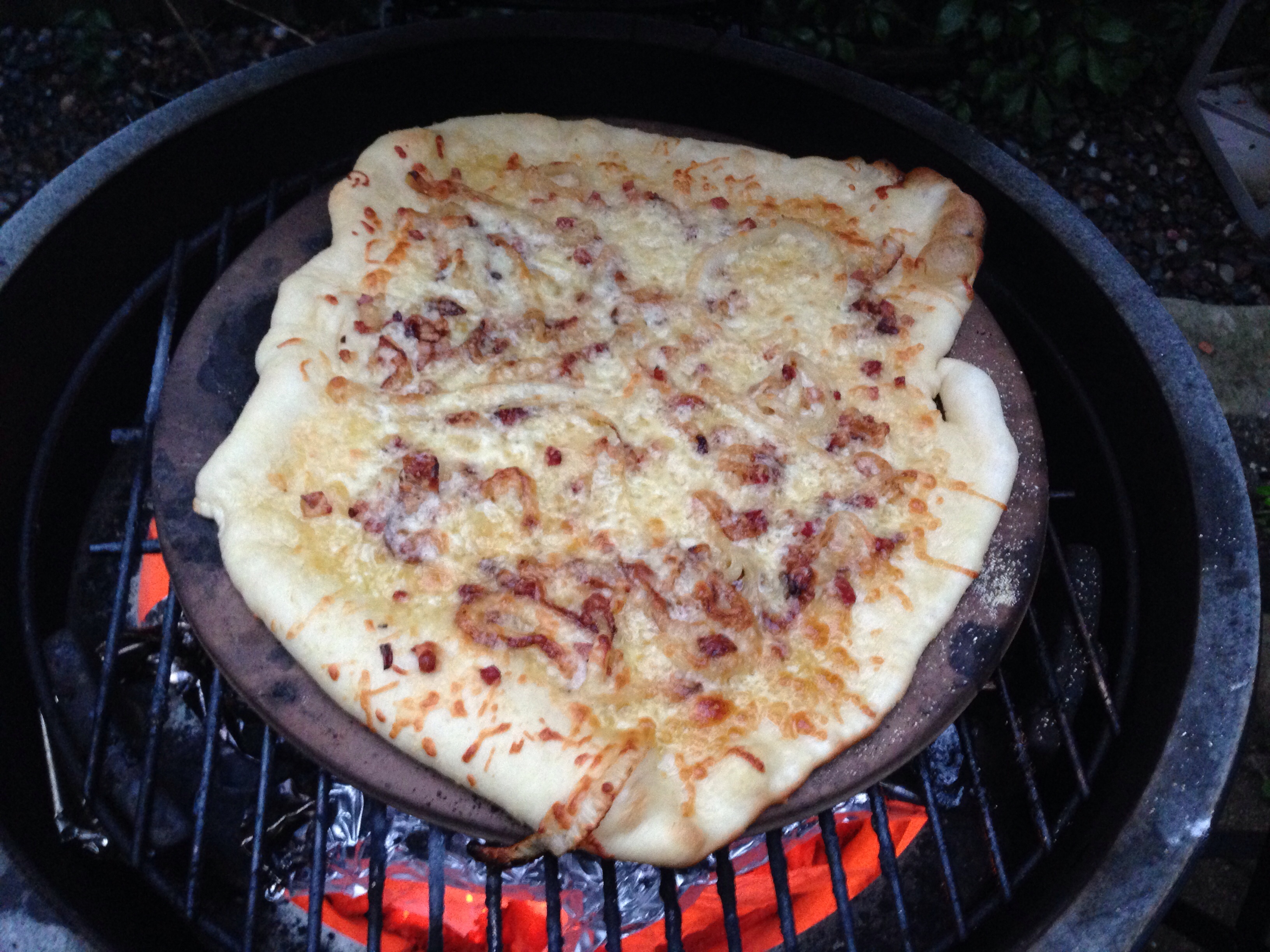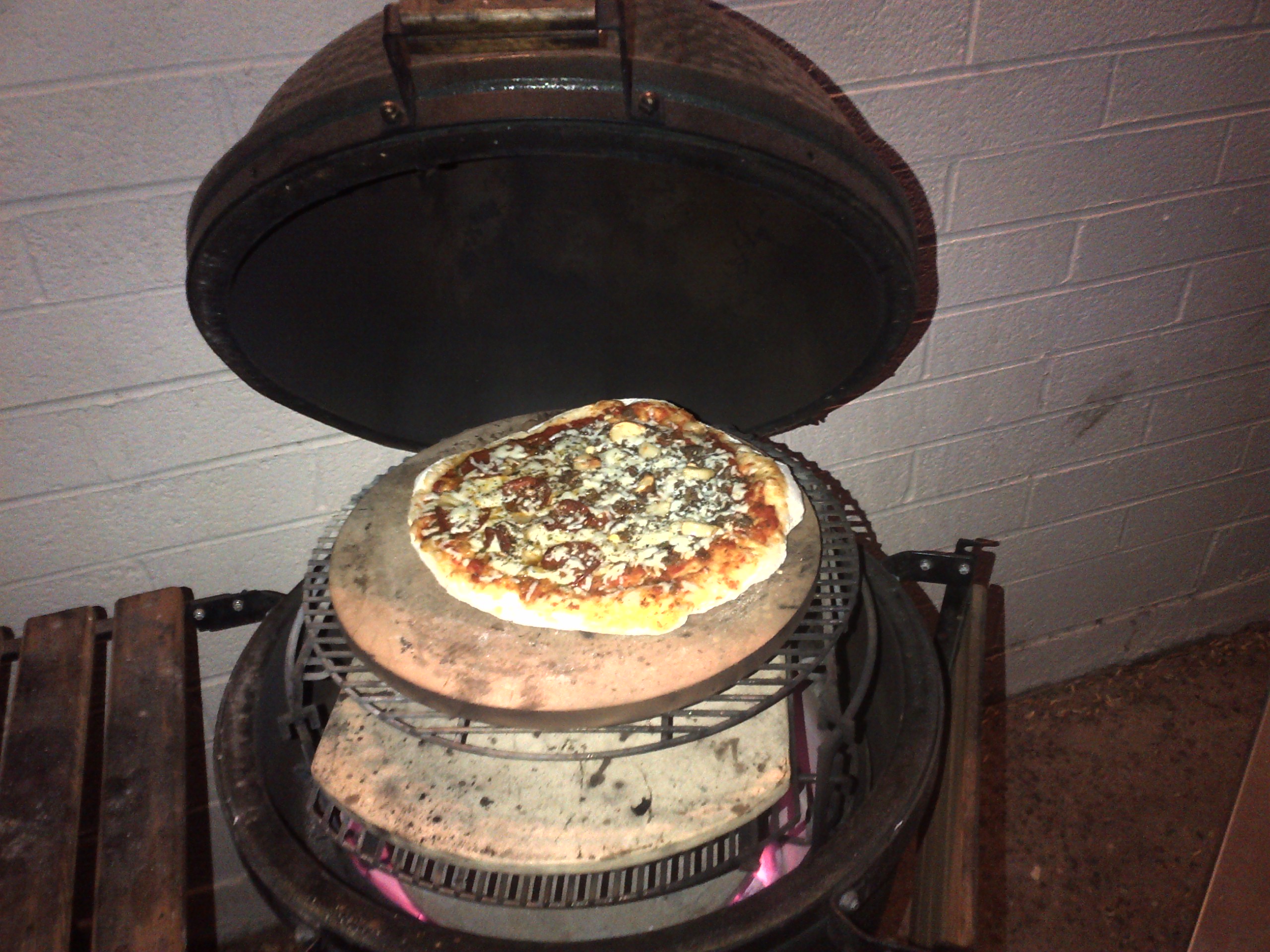 I've done 'za on XL and L and for some reason, the results always seem to be best on the LG. Get the adjustable rig, rig extender and get that stone hi up in the dome, I also have a plate separator in the form of an oval stone from CGS which serves as a second stone in the BGE which, surprisingly, is excellent at starting the 'za and then I put it on the upper stone to finish the toppings.