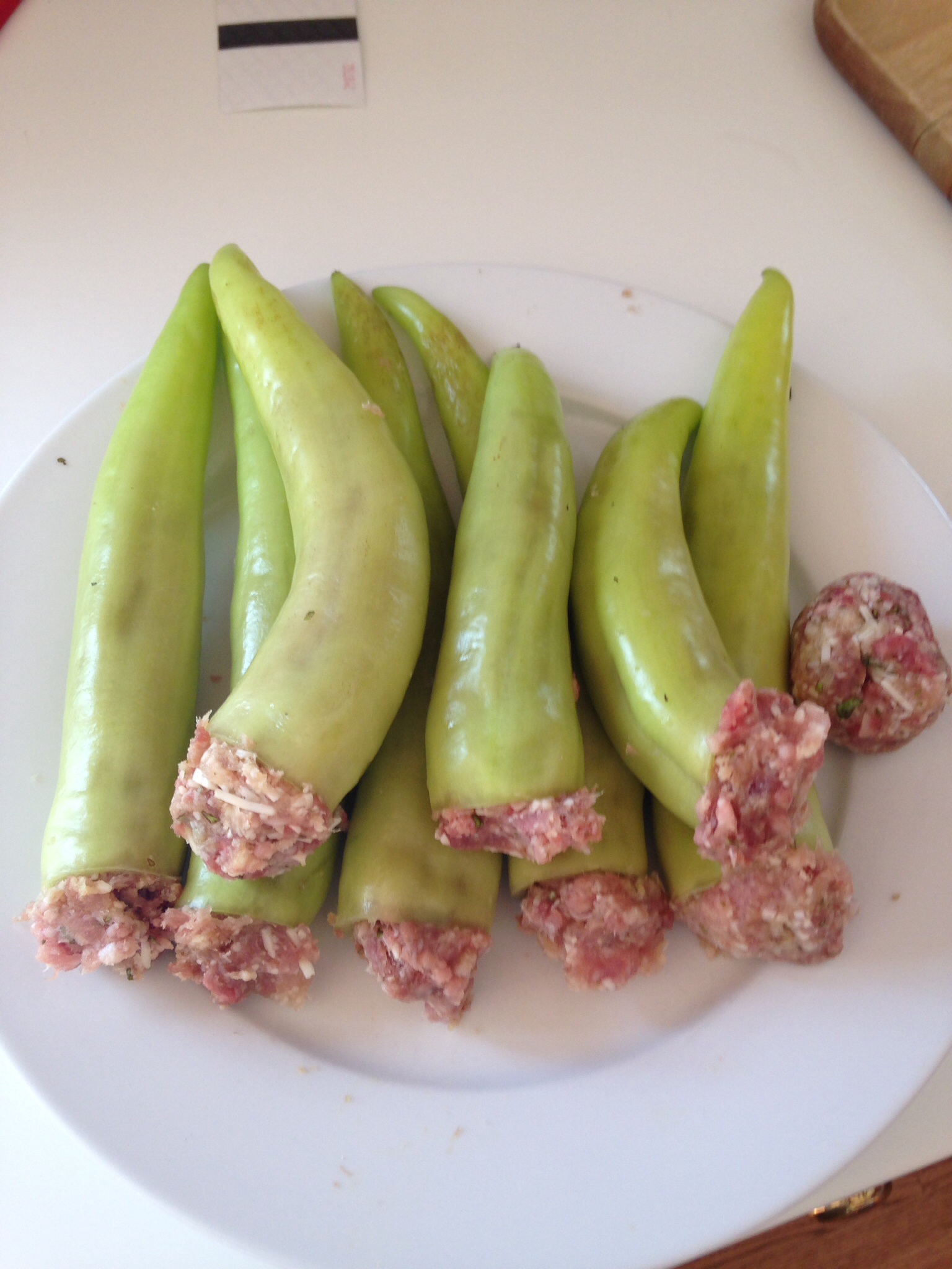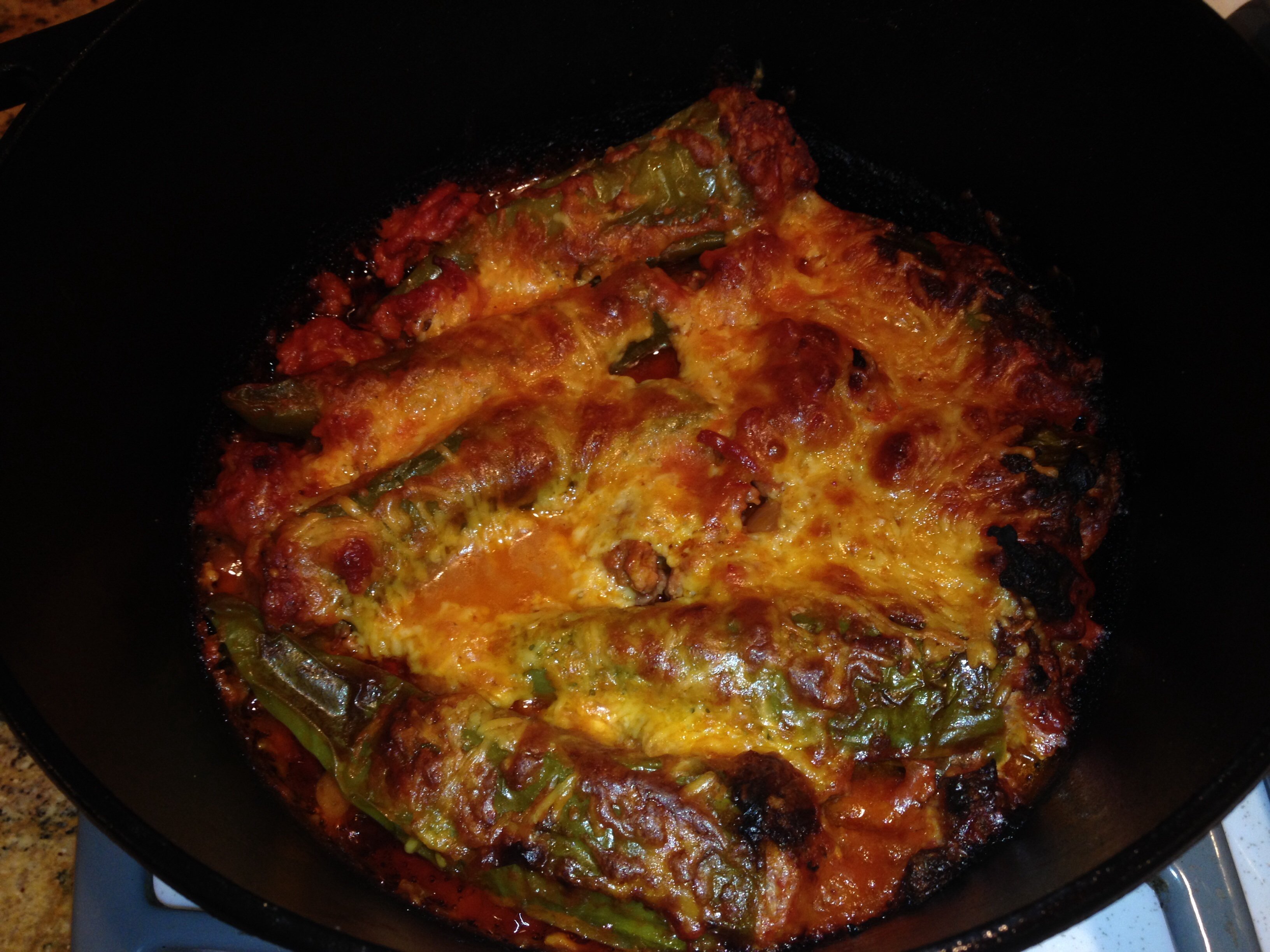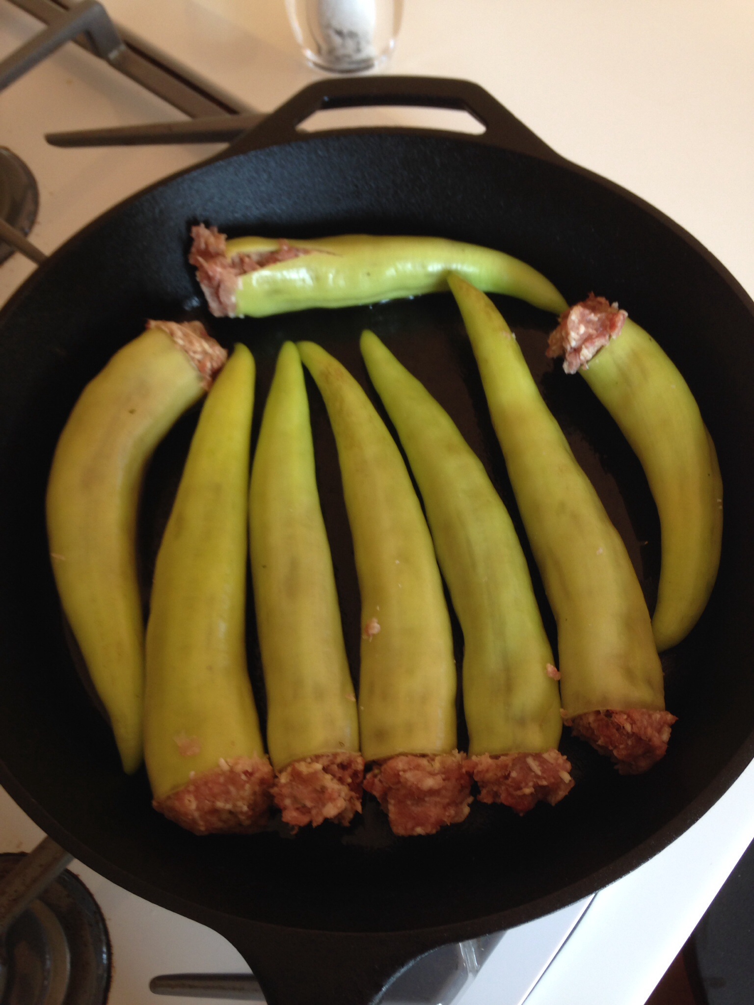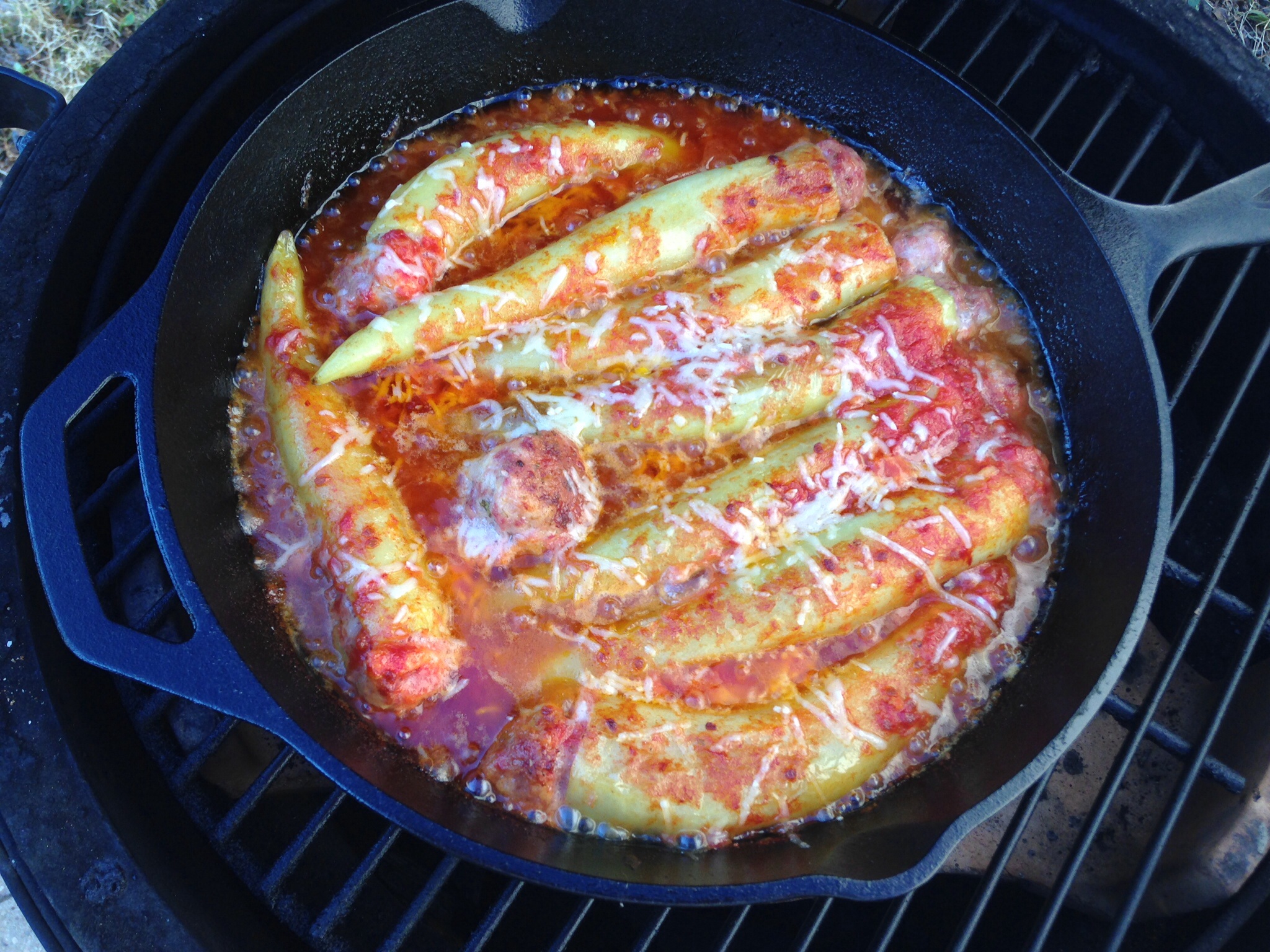 Our garden this year has been in overdrive and I found myself with a bunch of hot banana peppers. In trying to figure out what to do, I remembered one of my favorite restaurant dishes of all time. Johnny's Bar in Cleveland is a fantastic Old-School Italian restaurant and one of their signature dishes is stuffed banana peppers. I decided to recreate and cook on the Egg. I started with about a half pound total of ground beef, pork, and turkey. I mixed the meat with breadcrumbs, Parmesan cheese, Basil, Garlic, an Egg, and Salt and Pepper. I took my banana peppers and cut off the stem and hollowed out the seeds. I then stuffed them with the meat mixture. I set up my Egg Indirect at 350. While it was heating, I heated some oil in my cast iron skillet and put the stuffed peppers in to get some color on them. Once that was done, I added about a cup or so of Marinara Sauce to the pan and then out the whole thing on the Egg. It cooked for about 25-30 minutes and u added more Parmesan on too with about 5 minutes to go. These were really, really good. The peppers softened up as they cooed and all the flavors came together. I will definitely be doing this one again.