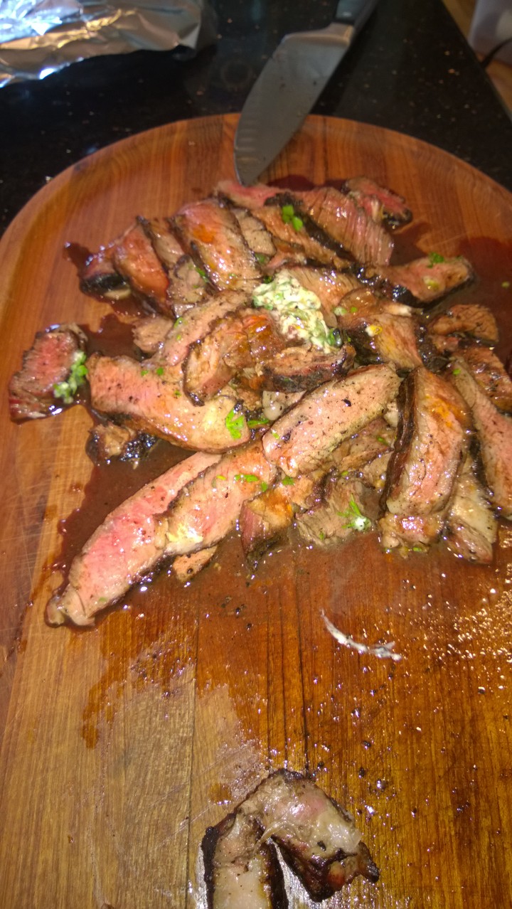 Board sauce of softened butter, garlic and herbs from the garden. Spousal approval confirmed.
