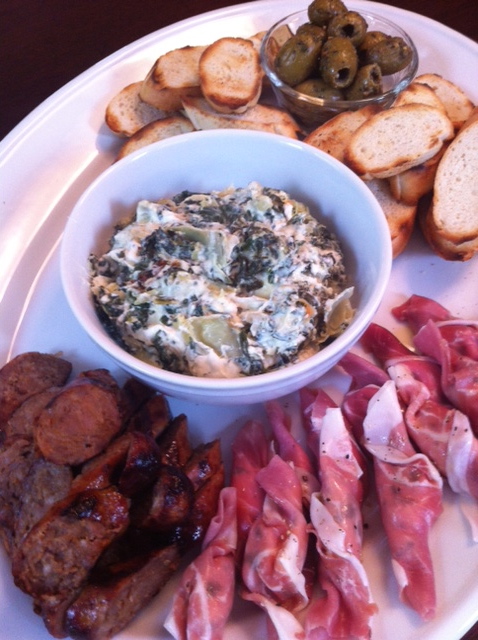 Ok, figured it out with no help from you guys LOL............Prosciutto twists stuffed with ricotta and fresh herbs (drizzled with peppery olive oil my wife brought back from Italy). Grilled Italian sausages (sliced) with peppers and onions, and spinach artichoke dip with grilled baguette. First pizza (My friends favorite according to his wife) Margarethe pizza with pepperoni added. Second pizza pepperoni, ground sirloin and provolone. I've been buying this awesome pepperoni from a little local market here they call Margarethe pepperoni what a difference over the stuff I thought was good before.Dearborn MI