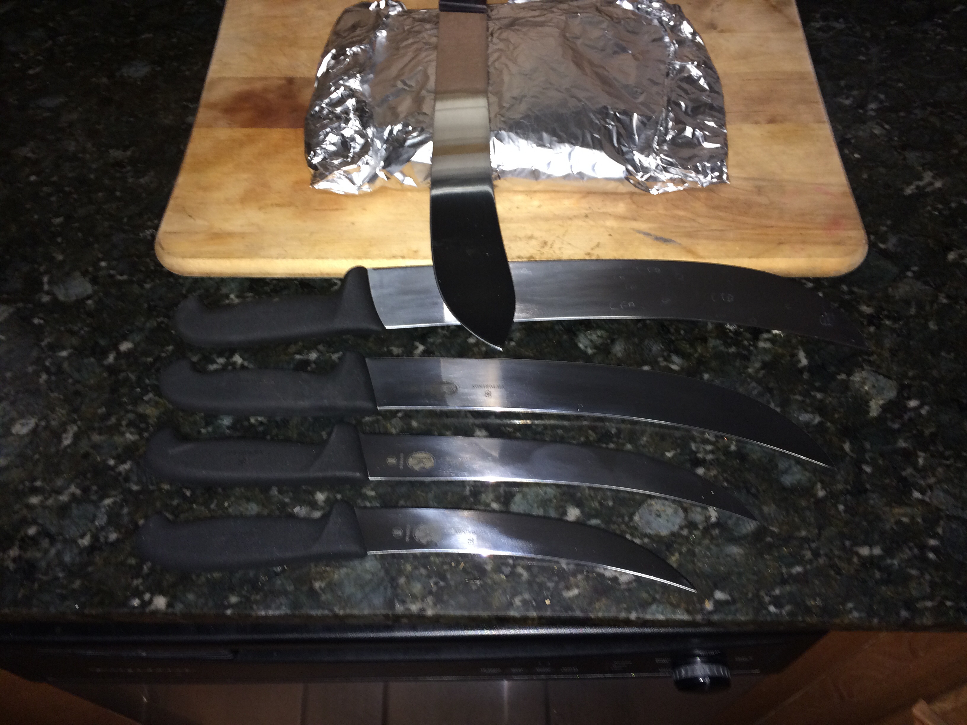 As to the knives everyone. Mine are Victorinox Breaking Knives. The blades are MUCH thicker than slicers, boning, general purpose or production knives. Again what you want is: Victorinox breaking knives 14" Cimiter curved breaking knife. 12" Cimiter curved breaking knife. The cheapest place to buy them is: Katom.com
