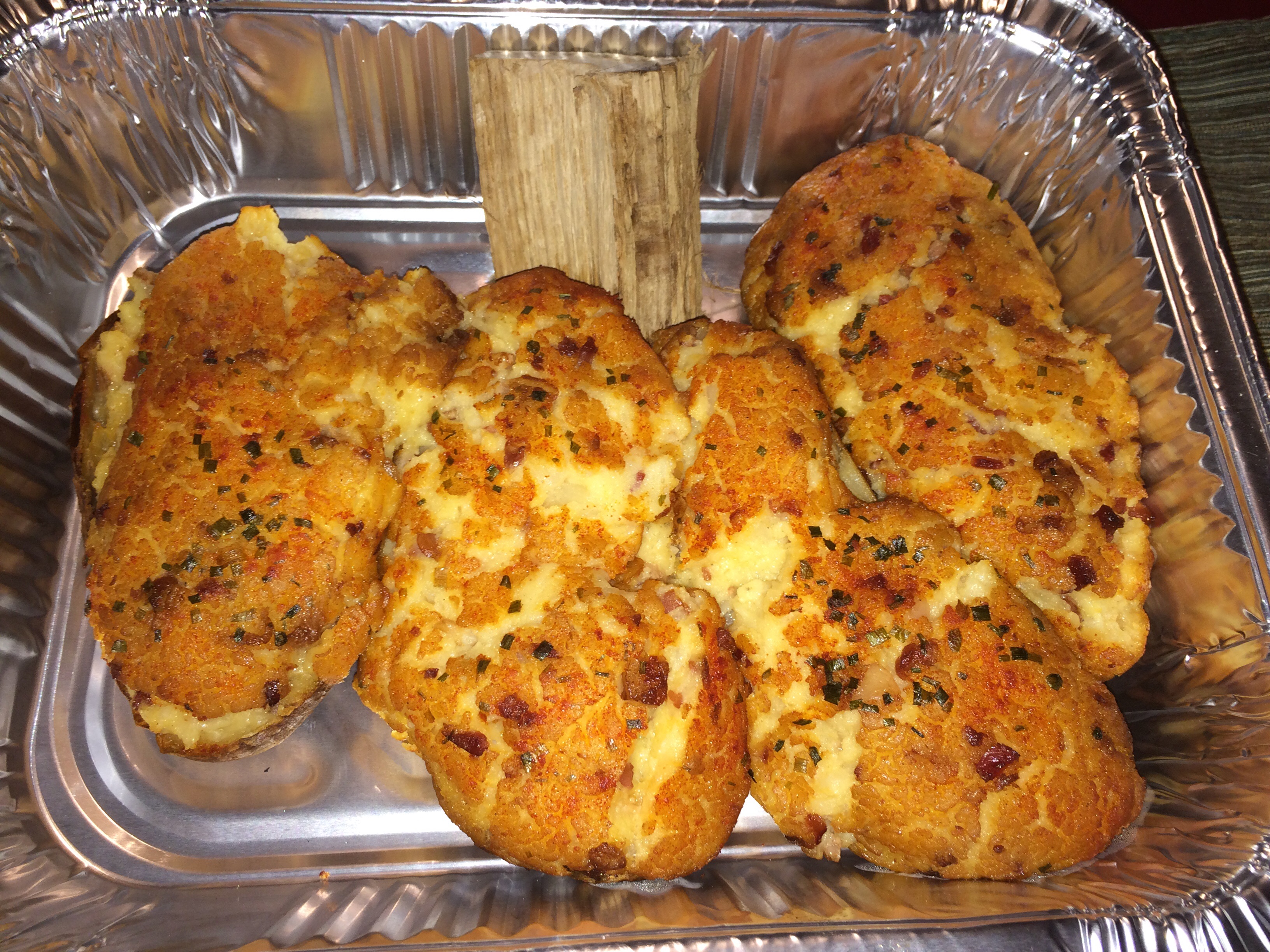 Potatoes stuffed with shrimp, crawfish, crab, onion, parsley, bacon, cheddar and mozzarella cheese.