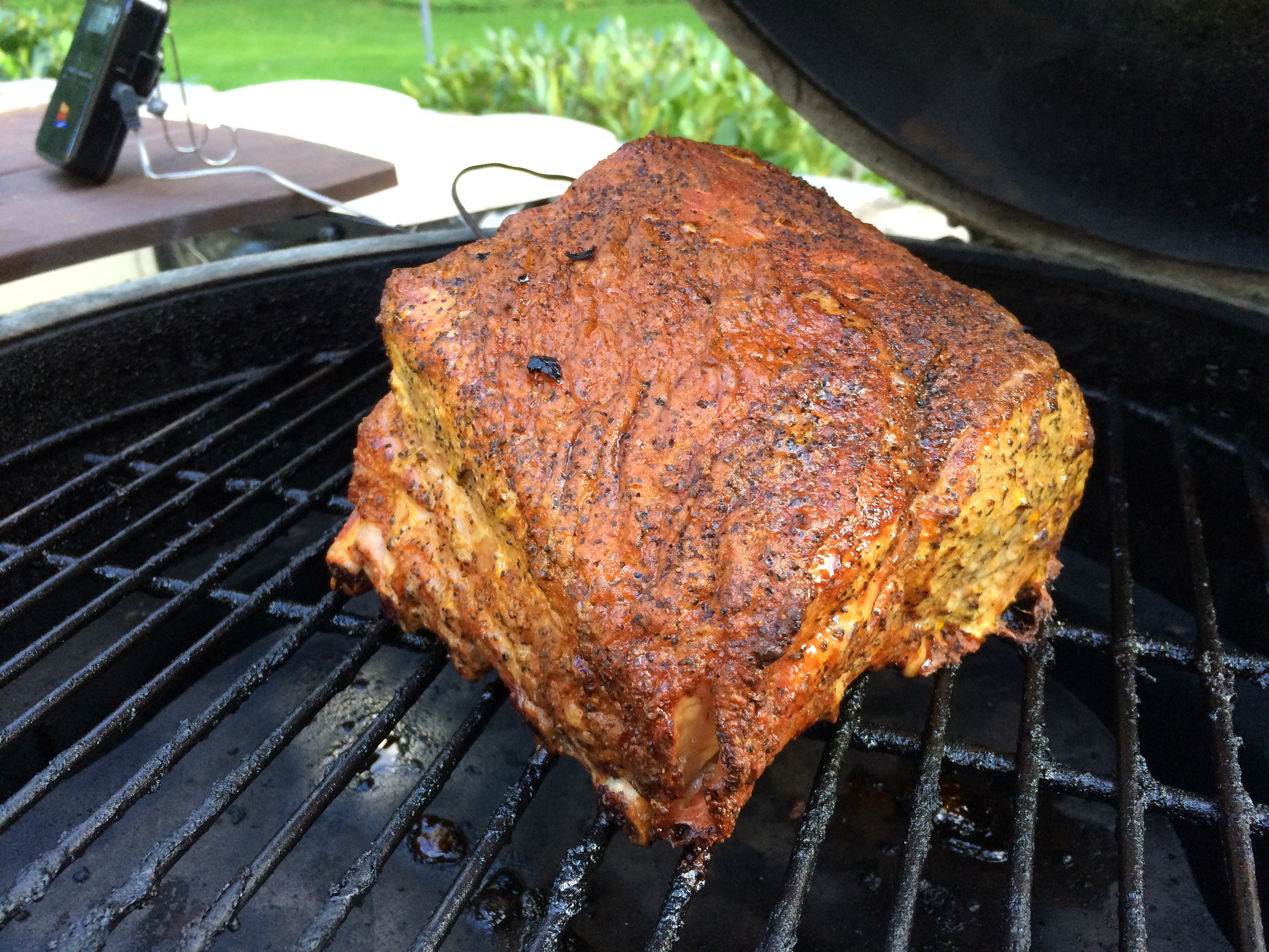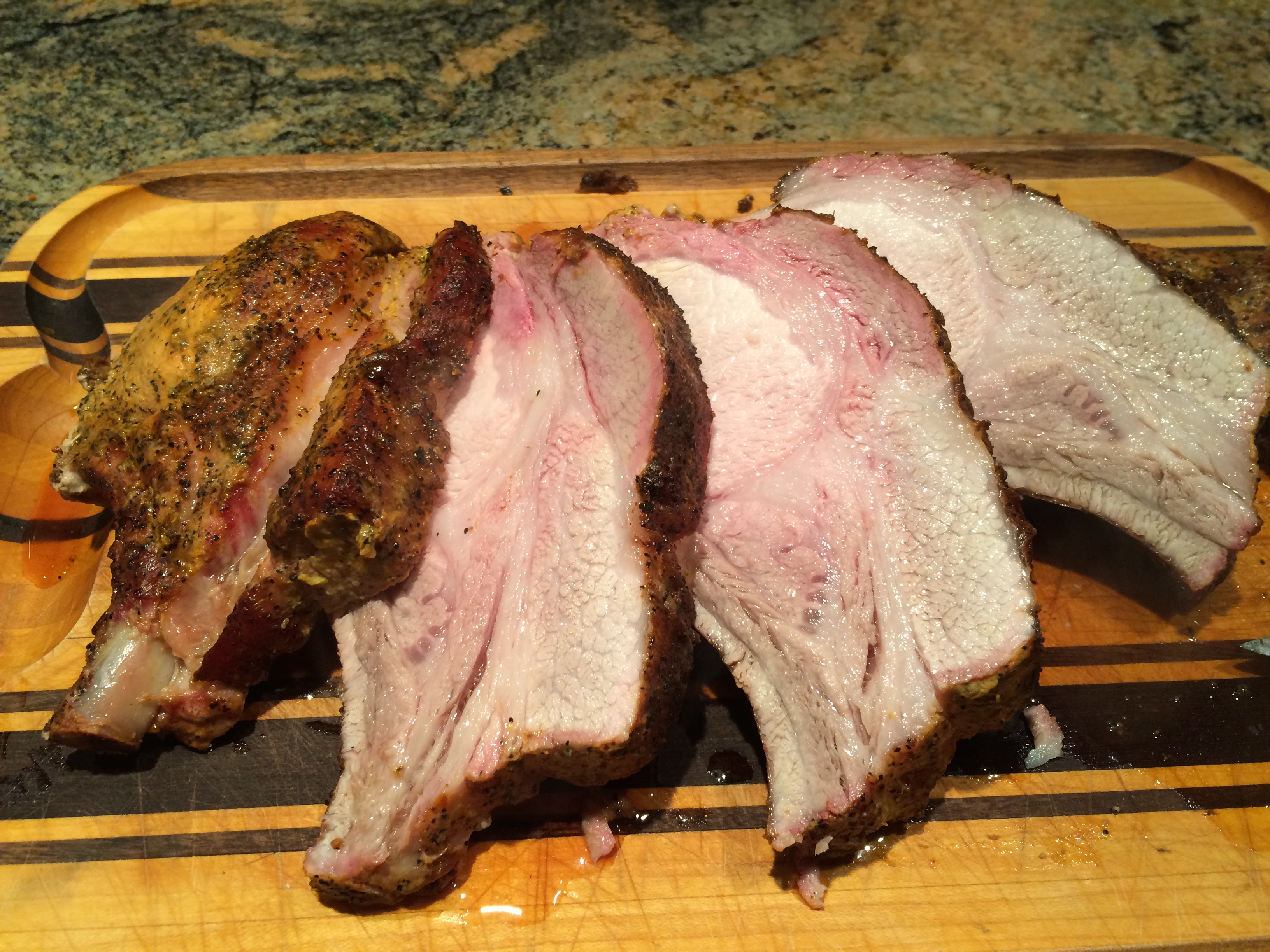 Nice compromise for those who like loin and those who like the bone. Almost 4 lbs, 5 bones and really thick when sliced. Not sure why at an average grate temp of 275 it got to IT of 140 much more quickly than I expected, but an hour or so FTC didn't seem to hurt it at all.