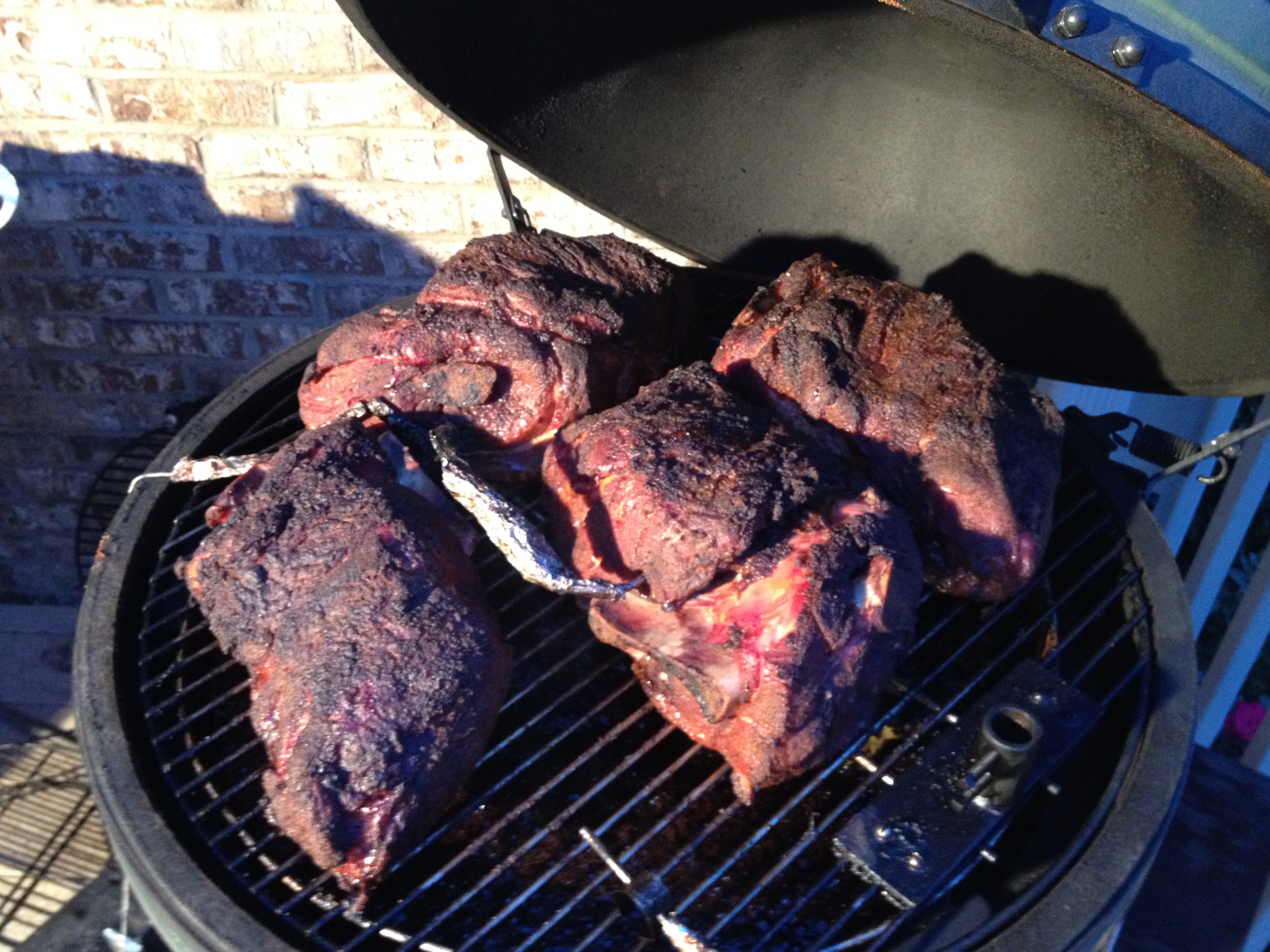 Two it is! Picked up another 8 lb butt last night. Going to coat them with Mickey's coffee rub and put them on tonight after work. Is there anything different about cooking the 2 butts at once vs one? Will I have to do anything special, like rotate them? Add more smoke wood?