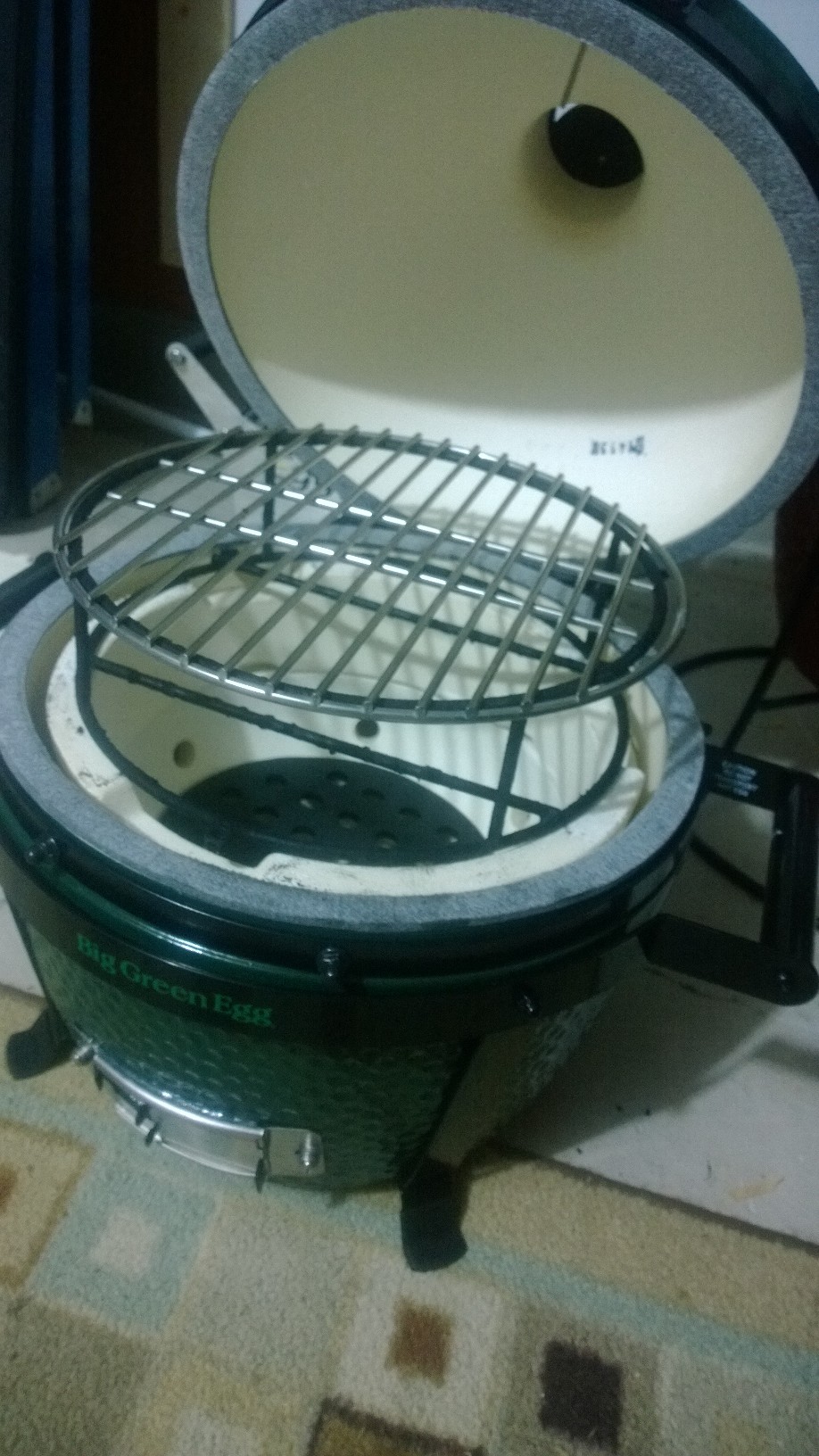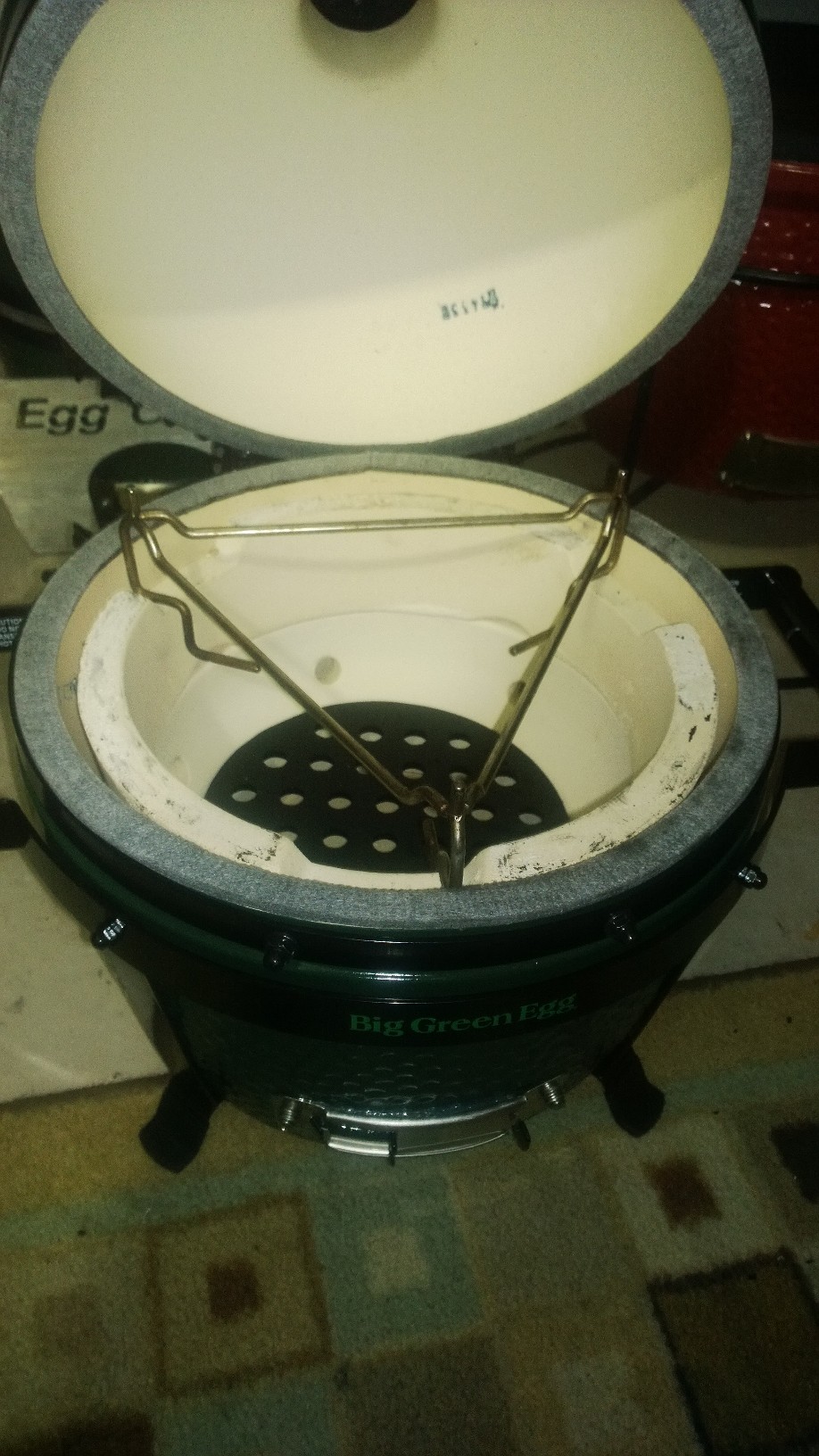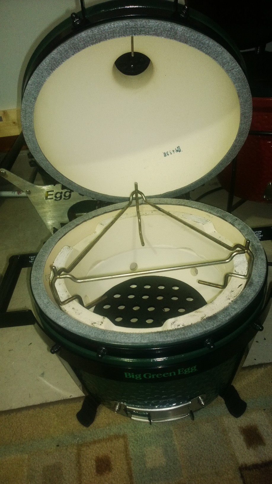 @Mickey the triangle thing is the KJ heat deflector. Its like a spider woo combo where the stone goes in the hooks hanging down for indirect or just take the stone out for raised. The dome is pretty high. The dome actually closes with the woo without the grate on the fire ring so that gives you an idea of the height even out on the sides. With the KJ deflector in the lower position in the grooves of the fire ring I am pretty sure you could still get a 8-9 lb shoulder in without an issue. I am heading to costco in a minute to get a couple shoulders so I will have pics soon. I just called and the KJ set up is $39.99 and the grate is $36. The BGE grate will not work with the KJ raised set up the 3 metal prongs sticking up to hold it in place do not line up correctly. The legs on the plate setter on this thing are like an inch maybe inch and a half. I am going to take my tile cutter bit on my dremel and make the notches in the fire ring deeper so maybe I can put something on the platesetter for the grate to sit on and create some distance.