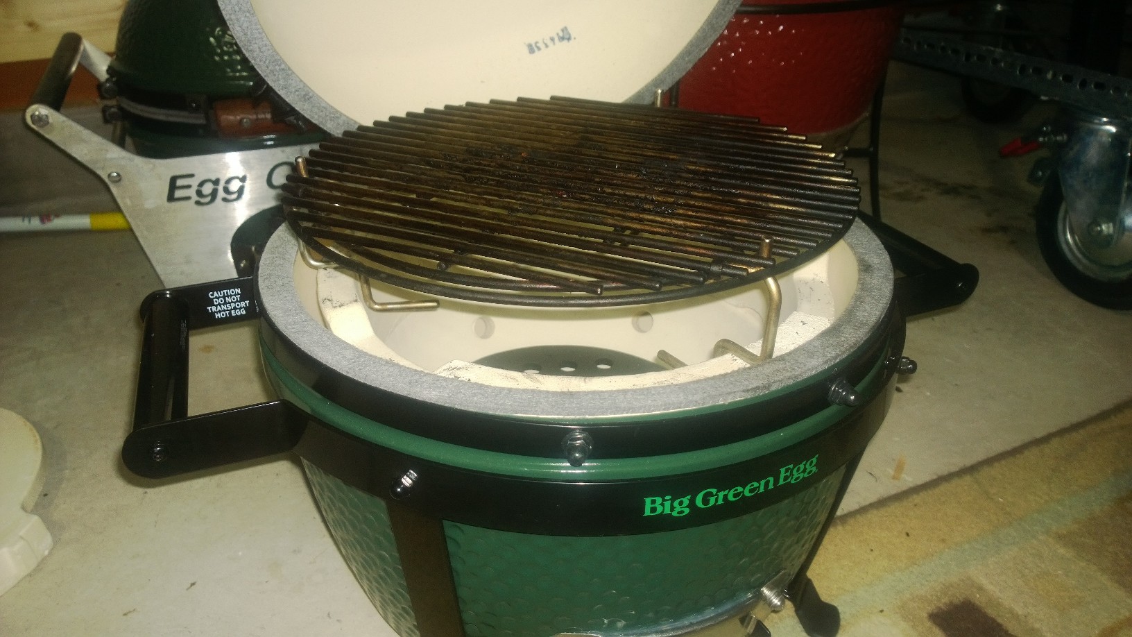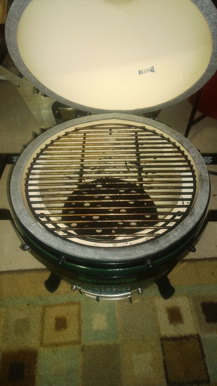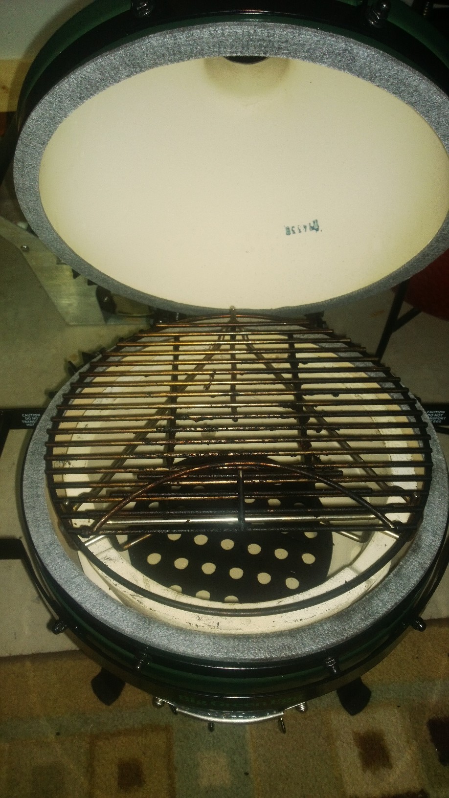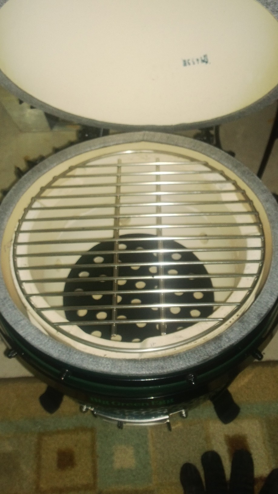 @Mickey the triangle thing is the KJ heat deflector. Its like a spider woo combo where the stone goes in the hooks hanging down for indirect or just take the stone out for raised. The dome is pretty high. The dome actually closes with the woo without the grate on the fire ring so that gives you an idea of the height even out on the sides. With the KJ deflector in the lower position in the grooves of the fire ring I am pretty sure you could still get a 8-9 lb shoulder in without an issue. I am heading to costco in a minute to get a couple shoulders so I will have pics soon. I just called and the KJ set up is $39.99 and the grate is $36. The BGE grate will not work with the KJ raised set up the 3 metal prongs sticking up to hold it in place do not line up correctly. The legs on the plate setter on this thing are like an inch maybe inch and a half. I am going to take my tile cutter bit on my dremel and make the notches in the fire ring deeper so maybe I can put something on the platesetter for the grate to sit on and create some distance.