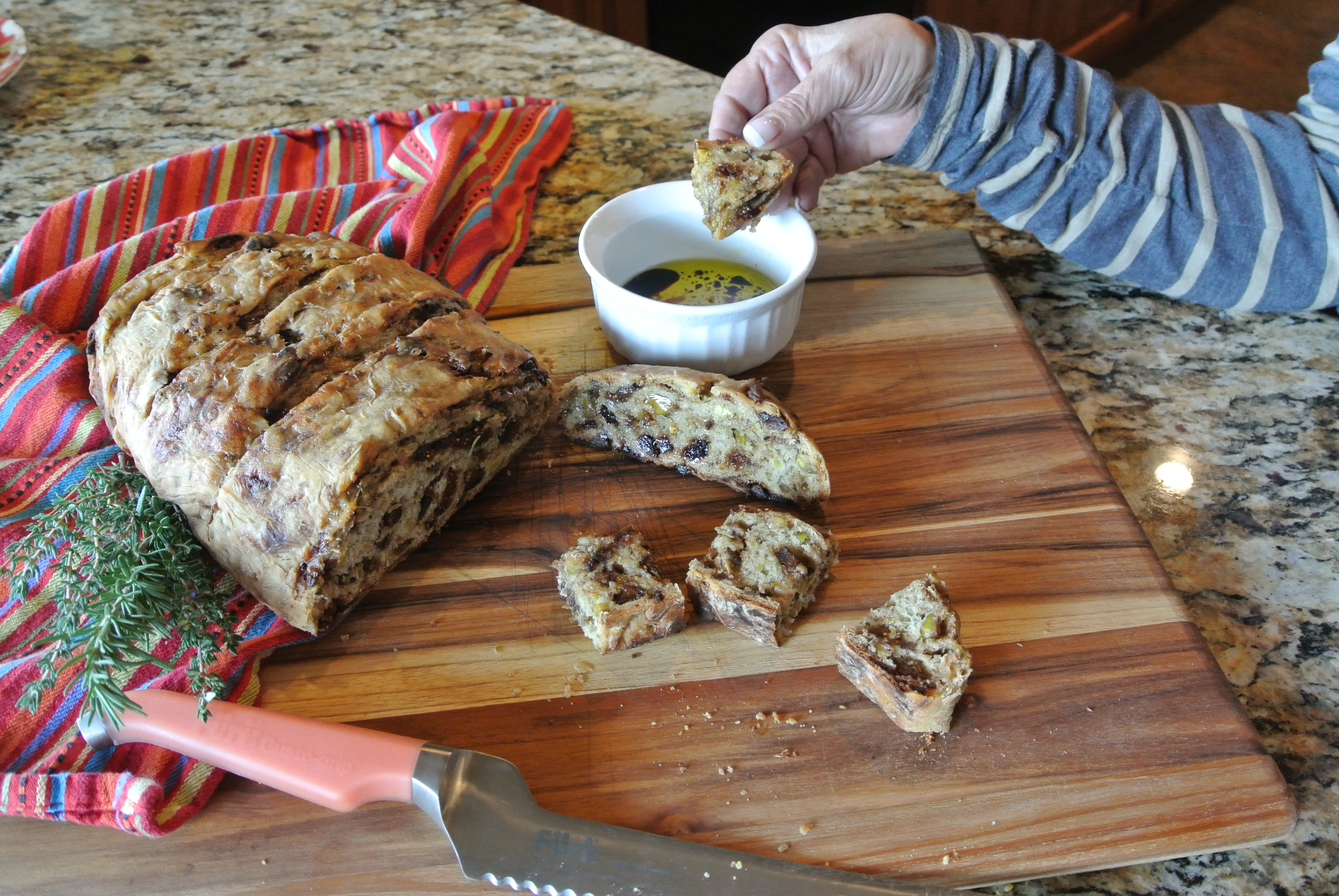 The creativity is not all mine. I actually saw the combination of figs and pistachios in a Tom Clancy novel. The bad guy, a terrorist, had bread baked over a wood fire, fresh figs, and pistachios for breakfast. I tasted them together and they were actually really good. The figs are sweet and the pistachios have an earthy flavor. They go very well with savory rosemary and thyme. Heres the recipe: