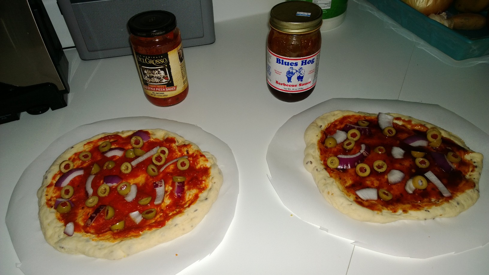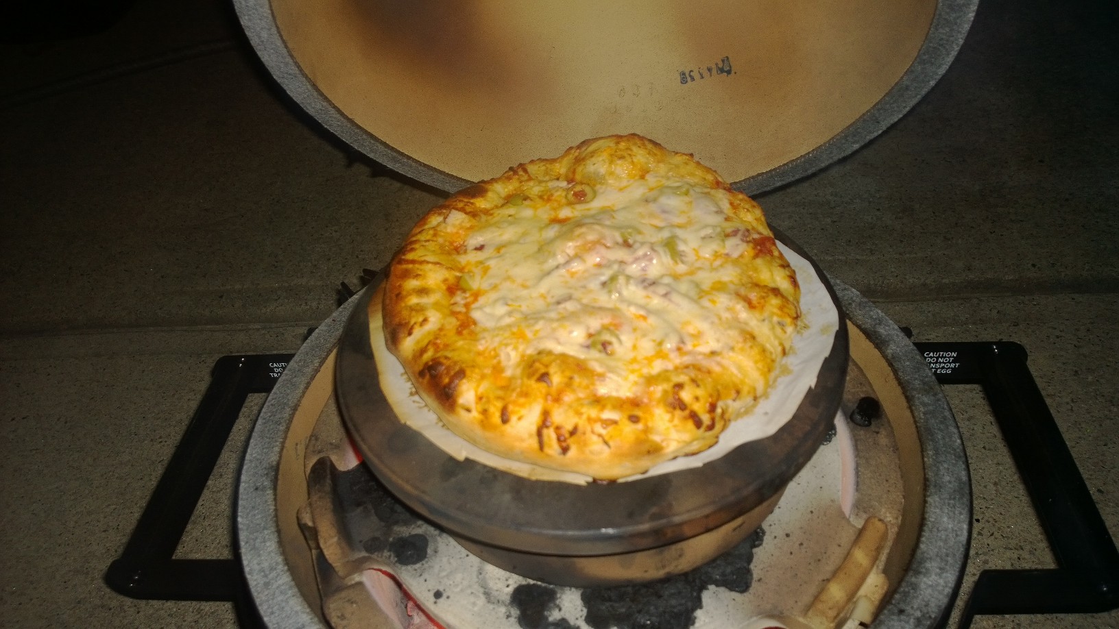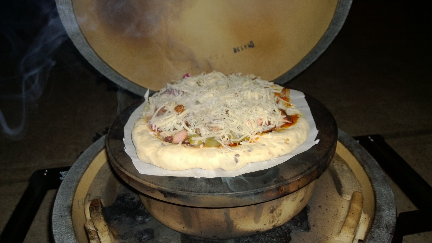 Made a couple pizzas on the MM tonight. Used th epubblix multi grain dough. Wifes got pizza sauce, red onions, green olives, mozz, and six italian cheese. Mine I used blues hog original, green olives, red onion, chopped pork, both cheeses, and pickles. The set up is teh MM plate setter with an old mini fire ring with the 10" stone on that. Dome was stabilized between 600-700 for both pizzas. Cook times was about 6 minutes for hers since she likes them a little doughy and about 8 minutes for mine. The MM nailed pizza and sat at 600 plus for an hour easily.
