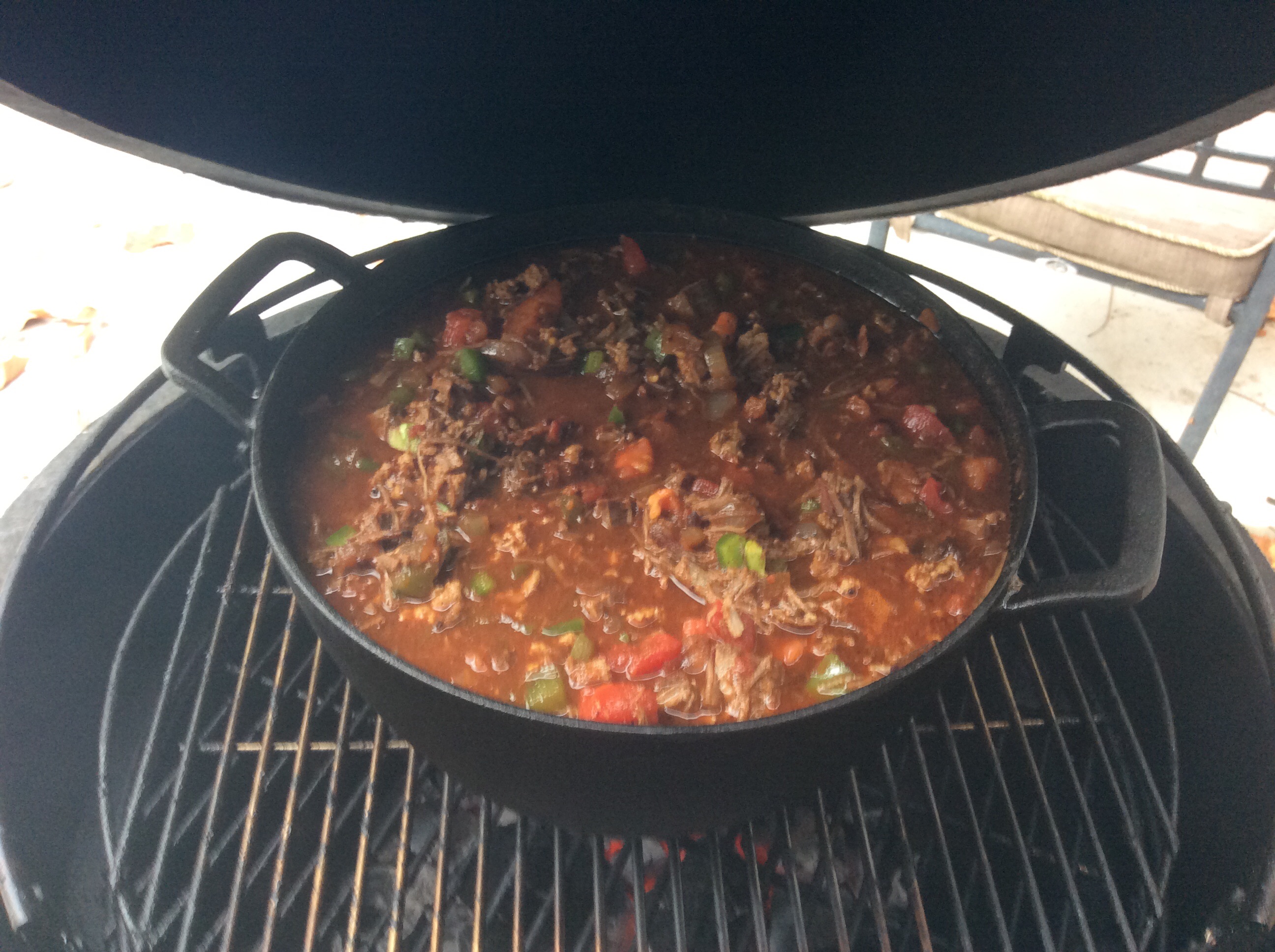 Storms coming later today so I decided to do a batch of chilli early and settle down for some football. Slight modifications from the smoked brisket Salado recipe.