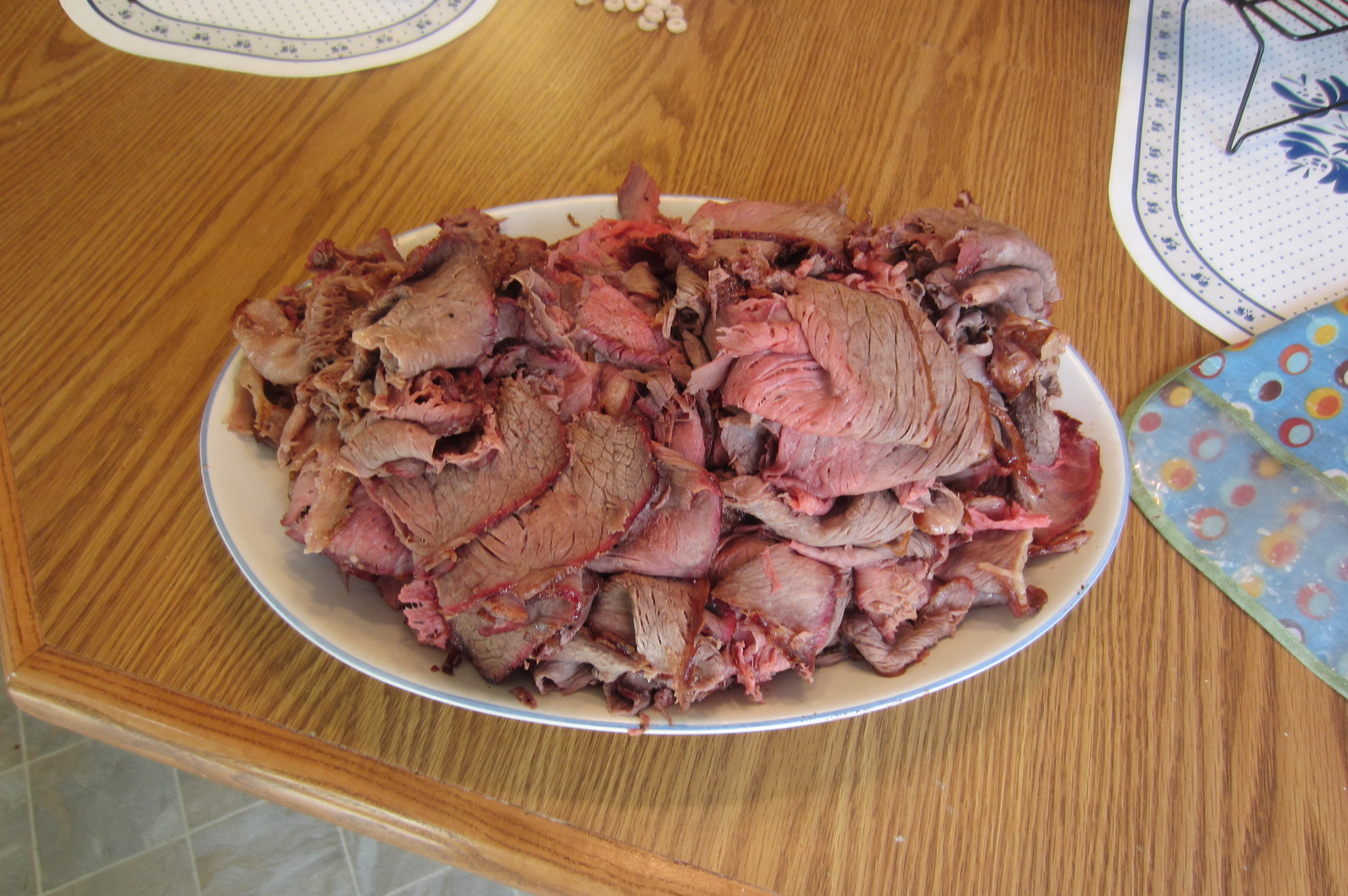 Started with a 7 lb bottom roast.  I rubbed it lightly with EVOO and SPOG, sat it in the fridge Thursday night.  Saturday morning, after a wonderful French toast breakfast with homemade bacon, I fired up the Egg to grill temp of 300 with a couple hickory chunks just for fun, raised and indirect.  I put the roast in, and almost 2.5 hours later, several places around the middle probed IT 130.  I was amazed at how quickly it finished, but this being my first time with roast beef, it was all totally an experiment.  So... I pulled it, and this massive hunk of beef smelled really good.  I wrapped it up in foil to rest while we put the kids down for a nap.  This next part is my failing... but I sliced it.  I didn't refrigerate it, no freezer, I threw it on the slicer and sliced it.  Had I refrigerated it, I probably would have been able to shave it thinner, but it still came out very good.  These are ready for sammiches.  Did someone say sammiches?  Oh, well let's bake up some homemade buns, whip up some homemade Arby's sauce, and we're ready for a big ol Arby-Q!  The beef is very tasty too, and quite moist.  Very happy with this cook.