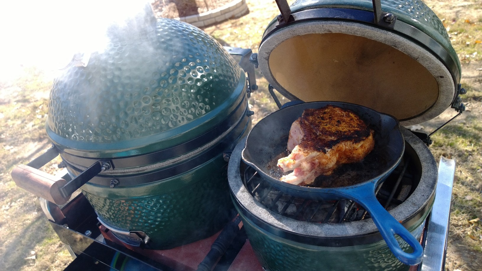 Ok i like the cart idea just would hate to see it roll off the concrete and fall over and break either egg. Dang chops look good too.1 XXL BGE, 1 LG BGE, 2 MED. BGE, 1 MINI BGE, 1 Peoria custom cooker Meat Monster.Clinton, Iowa