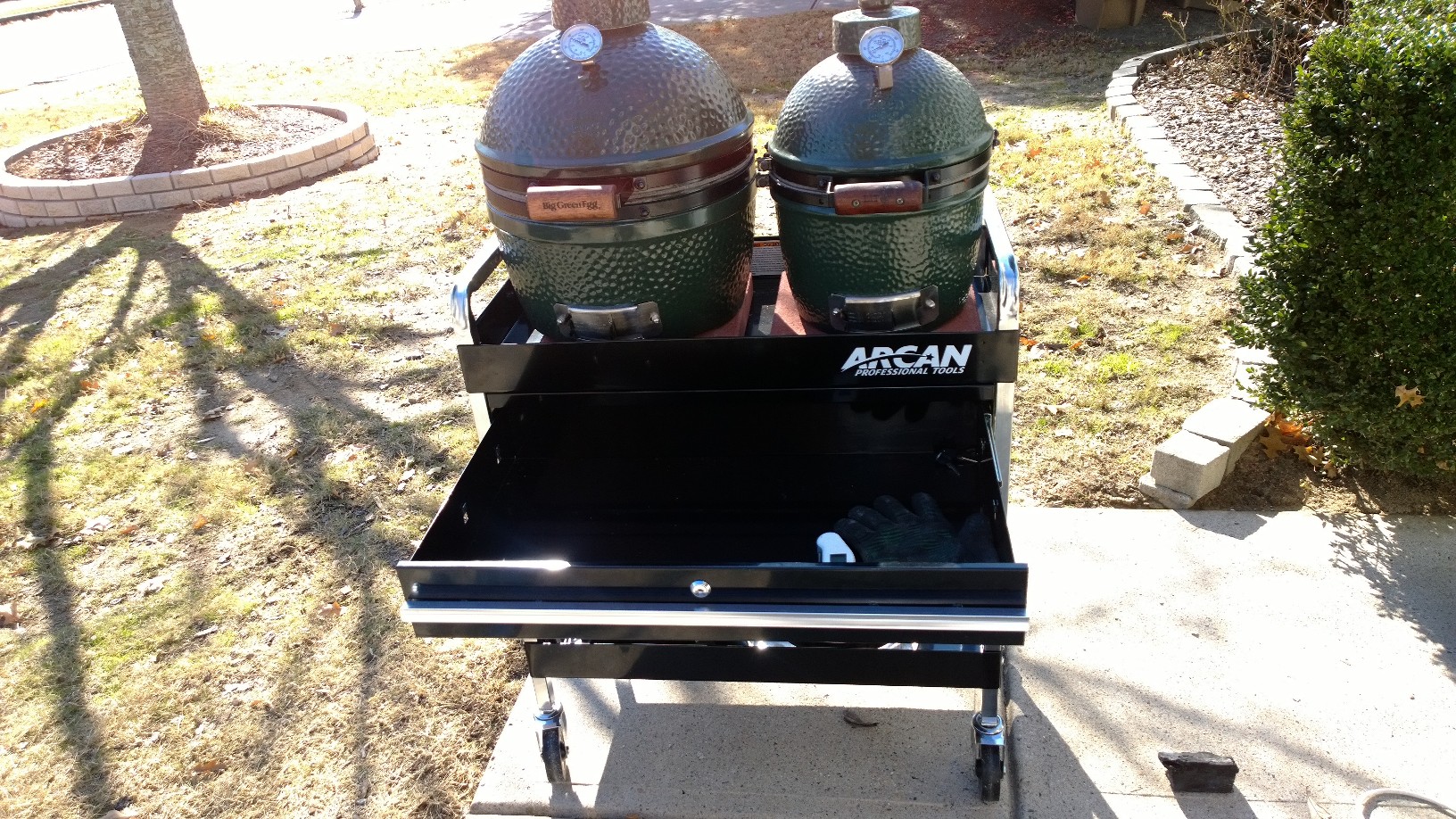 Hope that cart has locking wheels or i see 2 broken eggs in your future.1 XXL BGE, 1 LG BGE, 2 MED. BGE, 1 MINI BGE, 1 Peoria custom cooker Meat Monster.Clinton, Iowa