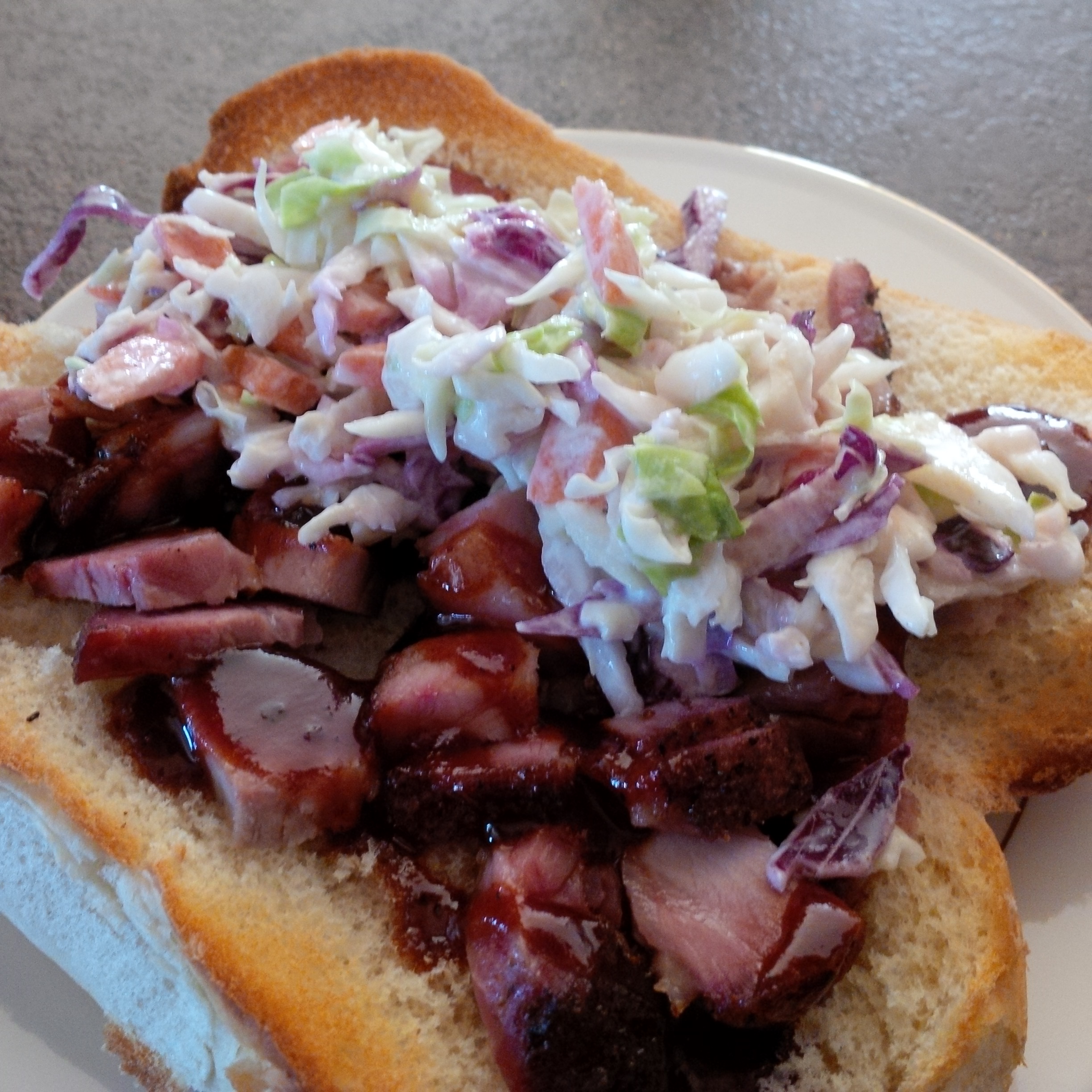 Left over smoked pork hocks cubed, sauced and toasted with a little slaw for lunch.