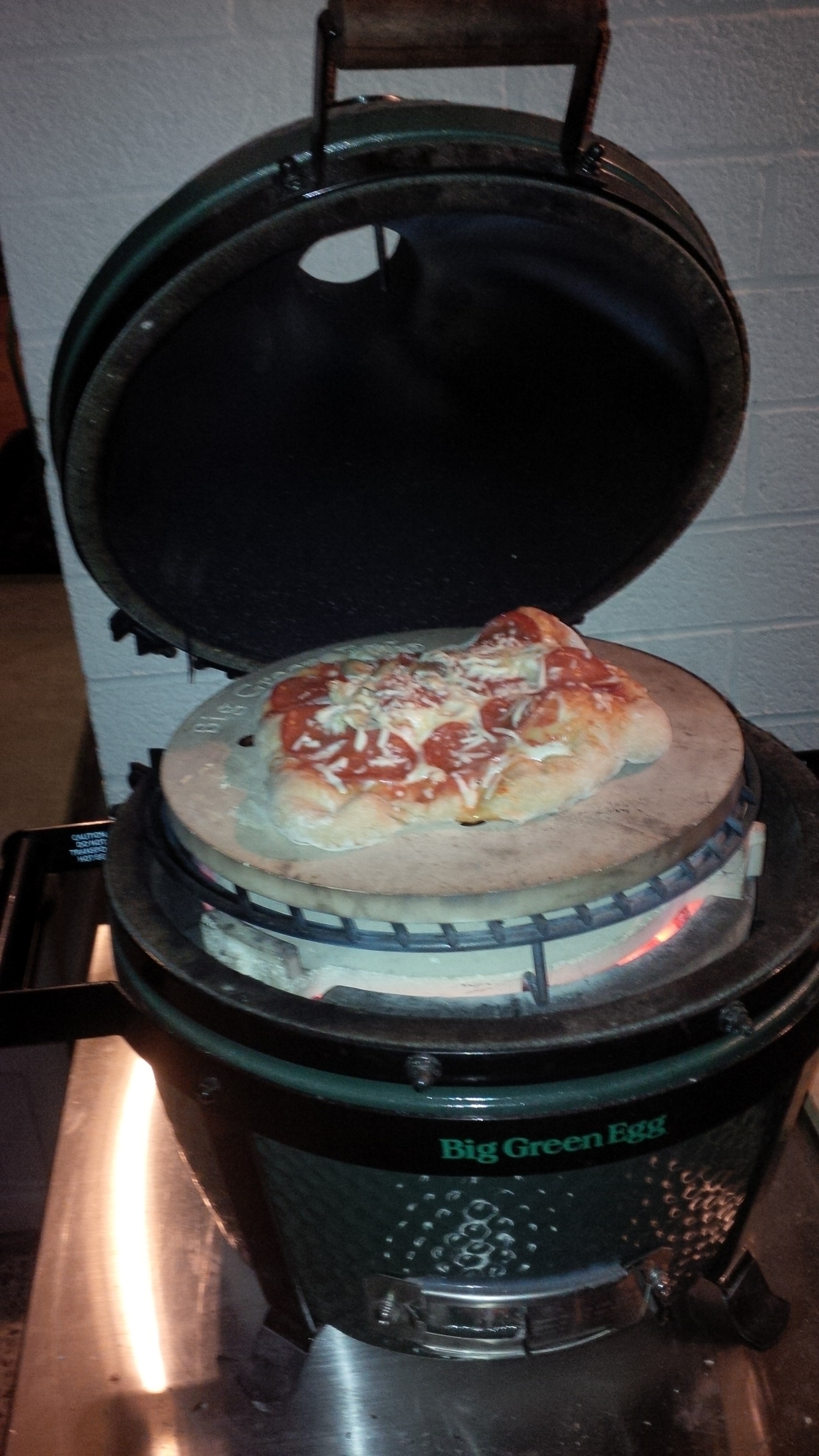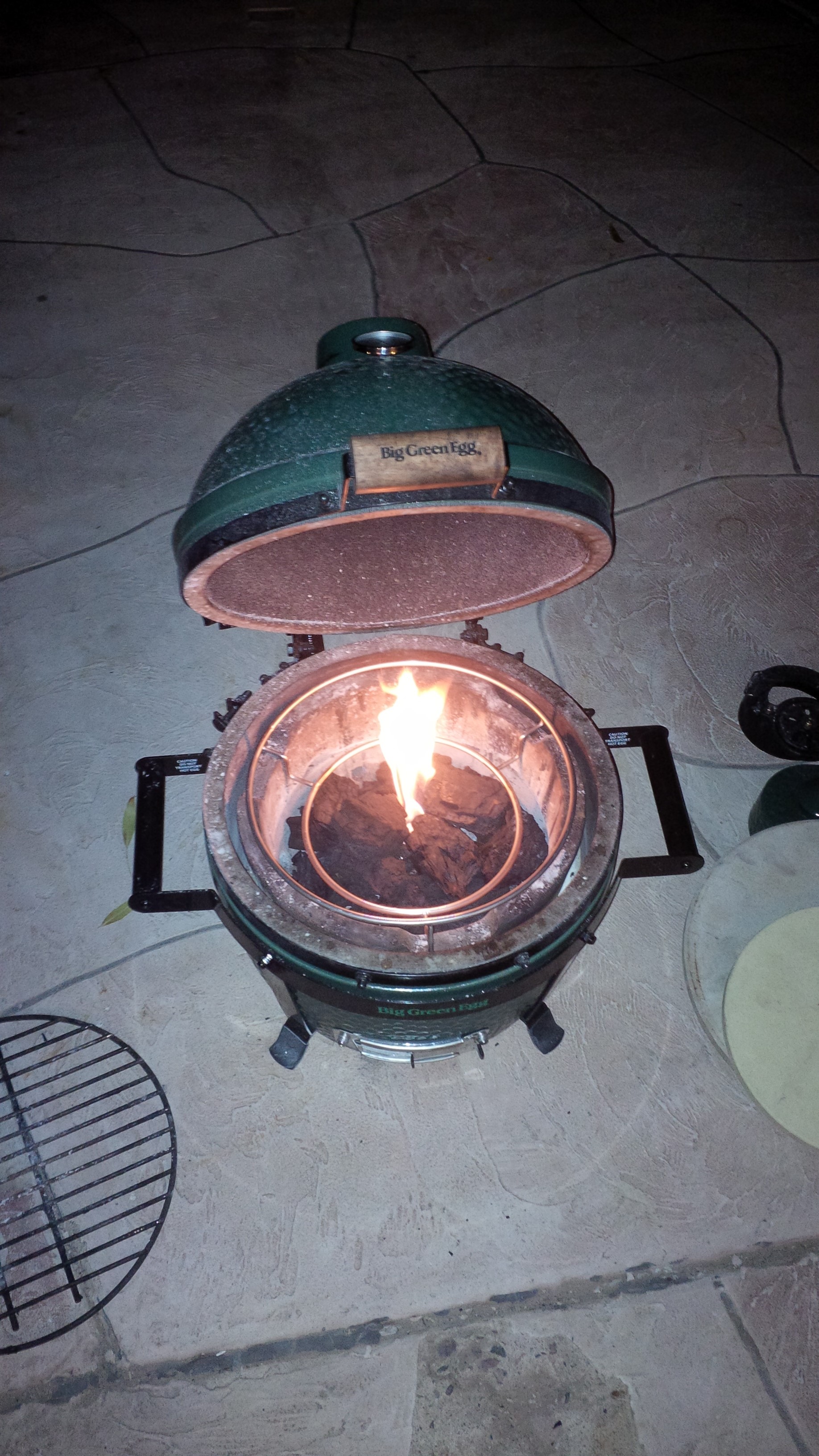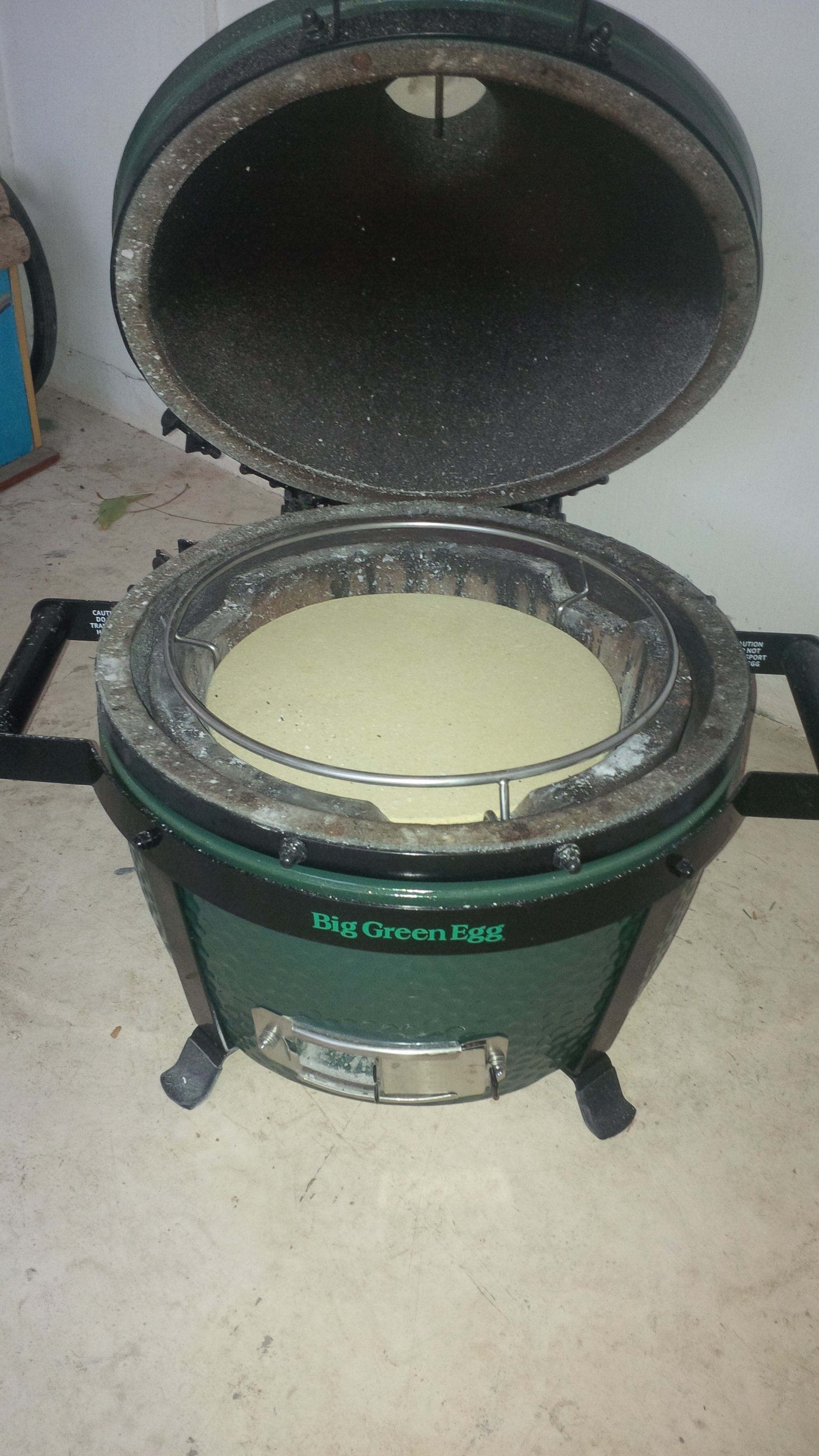 I like the setup, can't wait to see pizza pics.I use the woo / 13" BGE pizza stone on my small all the time and make fantastic pizzas every single time. Since the mini max is the same diameter i'm sure you will have similar successful results. After all the 13" stone is the one BGE sells for the small / mini max eggs, I tend to think they know what they are doing..Large & Small BGE, CGW Two-Tier Swing Rack for BOTH EGGS, Spider for the Wok, eggCARTen & and Cedar Pergola my Eggs call home in Edmond, OK.