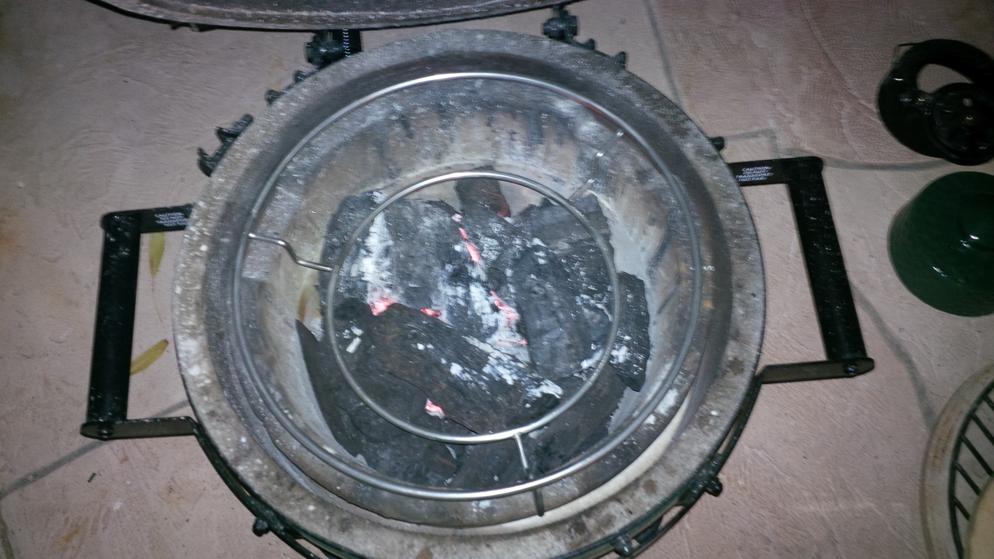 The setup was this: Platesetter, legs up within the MM woo (in case I had to recharge the fuel but this turned out to be a nonissue), the standard cooking grate on top of the larger diameter woo ring and then the 13' stone on top of that. NO air circulation issues, no issues with the stone being too high in the dome and inhibiting closing of the lid, etc. Just perfectly cooked pizzas, one after the other. This was great for a party because kids got to dress their own, adults got to choose what they wanted on them and the results were great. everyone had an awesome time. Thanks again BGE and CGS for helping me nail it! I decided to go with the platesetter instead of the 10" stone as the platesetter sits a little higher and I could put more fuel in to start.