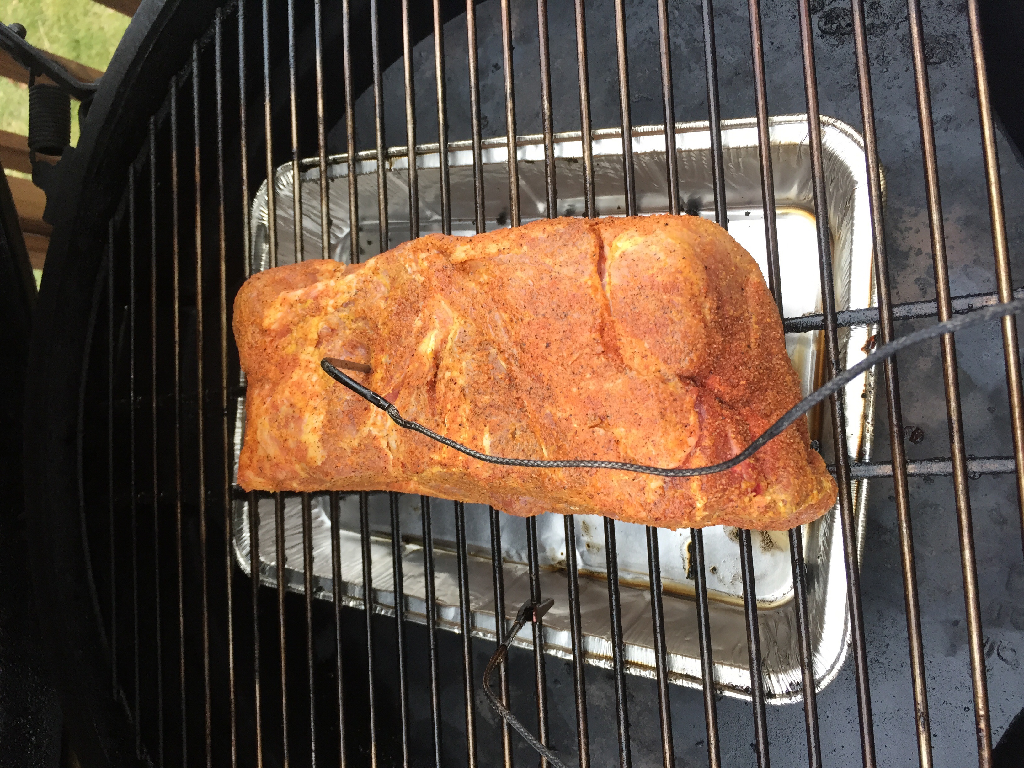 Duroc 4lber is on and grid temp and dome are stabilized at 225/250. Light coating of mustard and Bad Byrons. Fat side down with a few chunks of Hickory and Apple for smoke.