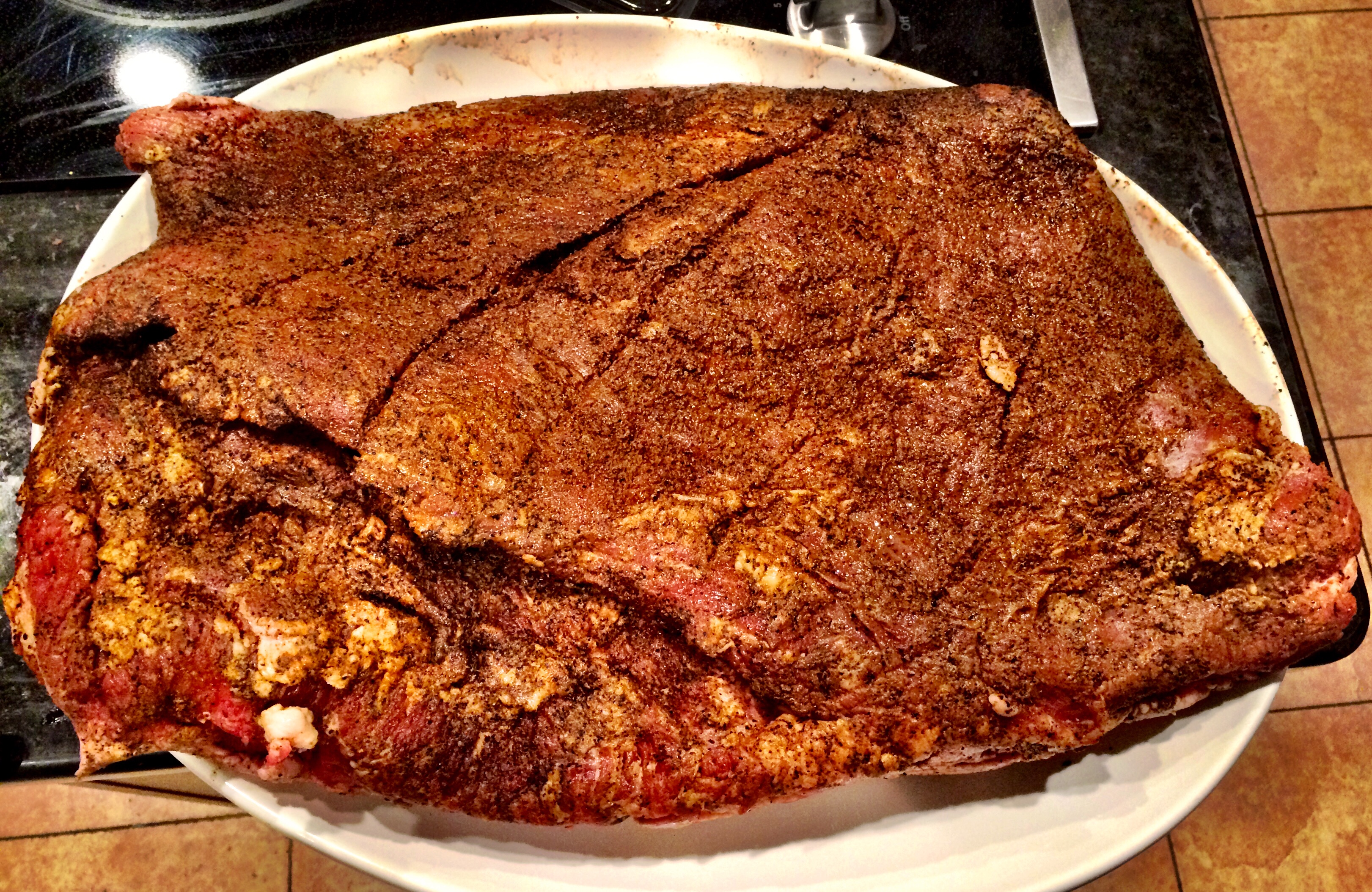It was 15.5 lbs before trimming, so probably about 13.5 lbs of meat. I'm not going to get it on before 10 tonight, so I should be okay.