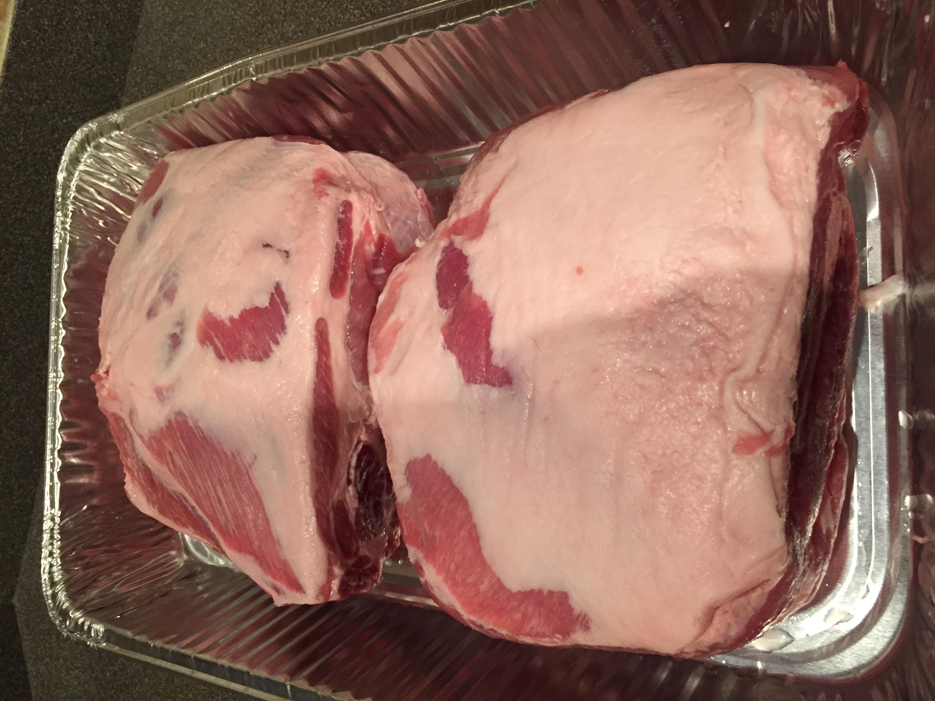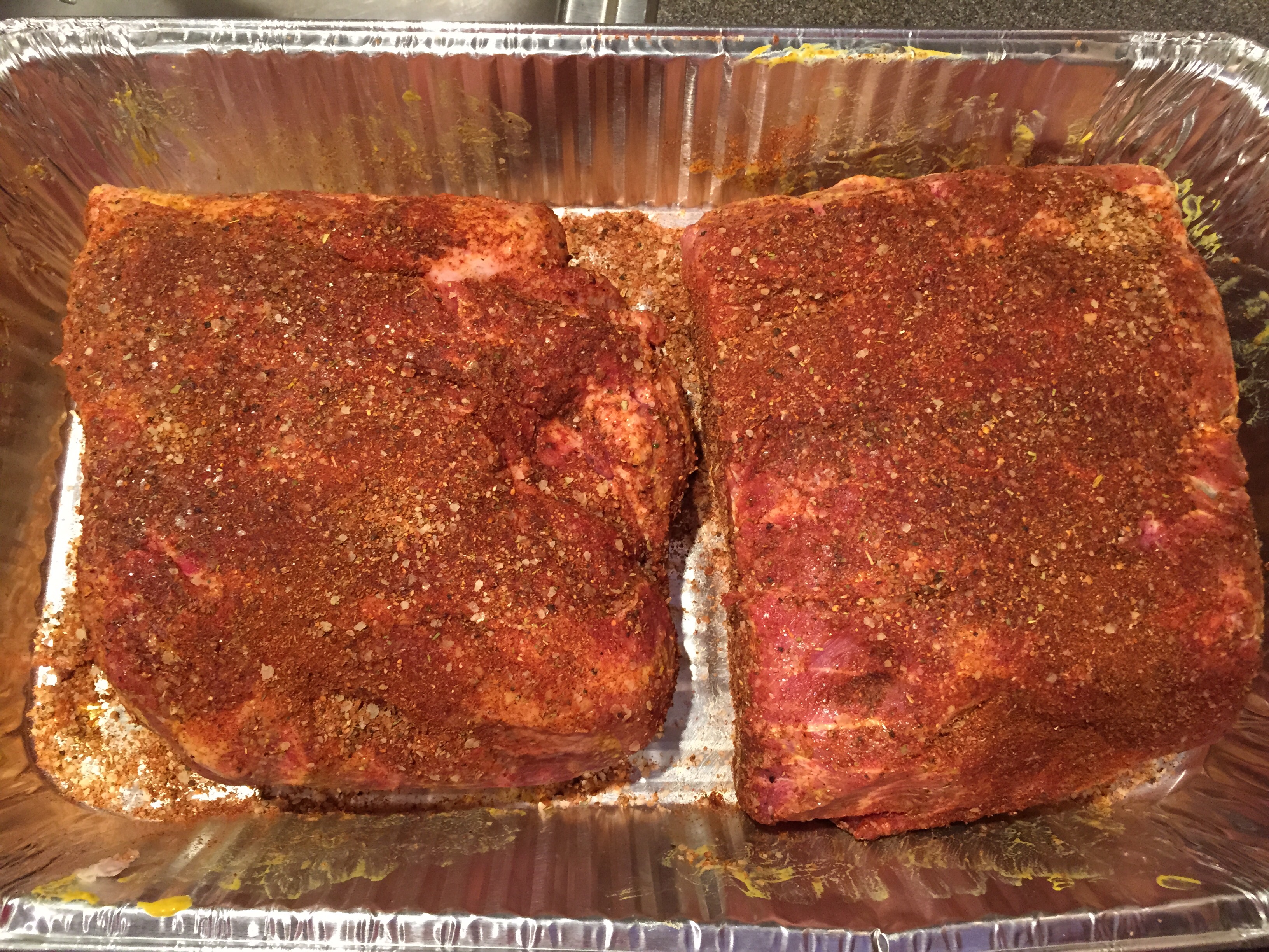 Just prepped 2 Duroc butts 7.4 and 7.9 lbs. Keeping it simple , no injection, Dizzy Pig Coarse Ground.