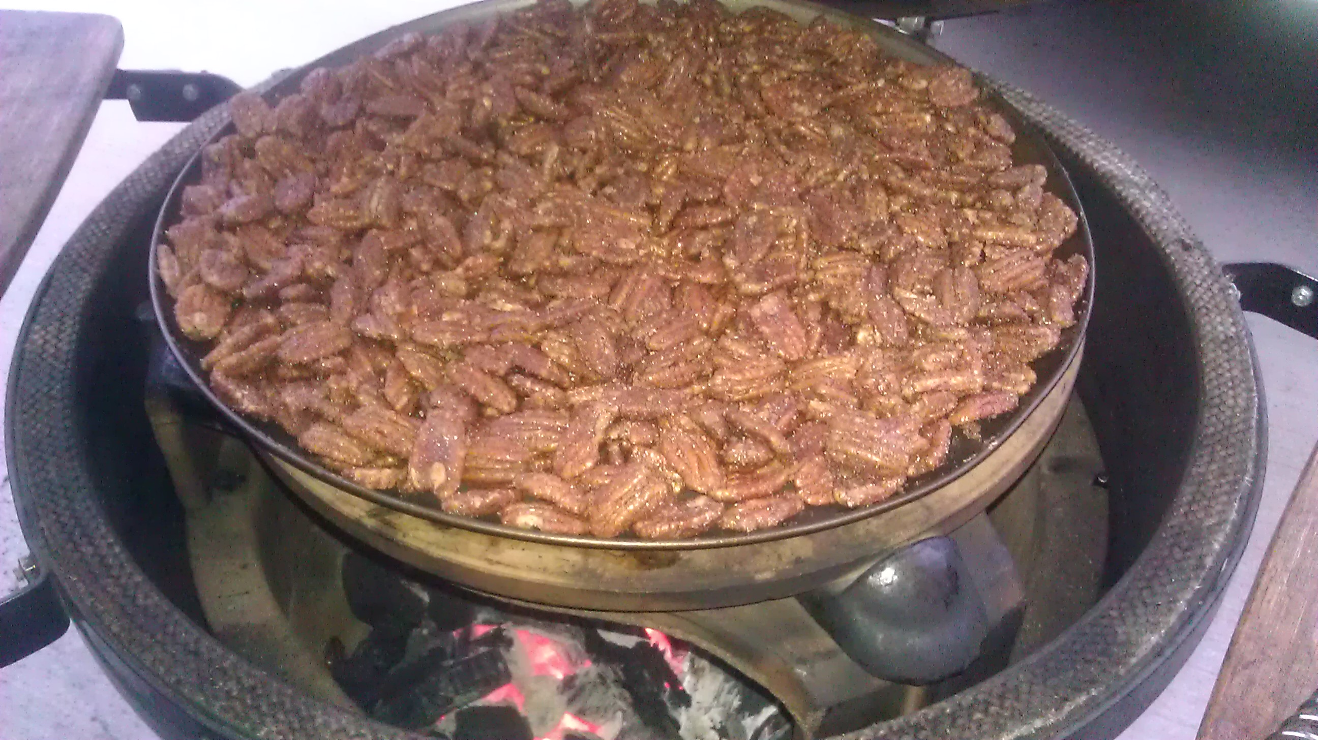 After what seemed like 48 straight hours of shopping which was probably only 4 hours I noticed my wife cooking on the egg when pulling into the driveway. She's an egghead. I asked her what she was cooking. She said, ”smoking pecans for the doctors I work with”. Cool. She can make some killer glazed pecans. After about a half hour on the egg my wife went to grab the pecans. She gave me a test sample. It was super smokey. I asked her what she used for smoke? She said that she used a couple chunks of wood. Turns out it was my oak chunks. It was edible but the glaze lost most of it's flavor with the heavy smoke from the oak. I told her not to worry. I woke up this morning and took a trip to the grocery store to pick up some pecans. Damn they are expensive! My wife picked up two pounds of pecans for $12 at Sams Club. My local grocery store at 6am thought they should cost $25!. Ouch. Oh well. I didn't want my wife to feel bad about the smoke mishap so I thought I'd grab a coffee for her at the local coffee shop. I feel like a total idiot when trying to order coffee. I'm not a coffee drinker so most of the words on the order board are foreign. So I went with a turtle mocha. ”Sir do you want white chocolate?” Ummm ok? I guess so. So I pull up to the drive-thru window trying to remember what I just ordered. They could have gave me straight black and I would have said that's exactly it. As the barista (I think that's what the employees are called. Maybe it's just the girls?) hands me the coffee and says, ”the car in front of you paid for your coffee”. What? Seriously? That's awesome! How cool is that someone would do that for a complete stranger! So I told the barista that I would get the car behind me. I had a fun time getting coffee besides the whole ordering part! When I get home my wife makes the glaze and pours it on the pecans. I told her not to worry about getting the pecans on the egg before leaving for work. I didn't have to work until 10am so I said that I'll throw them on the egg and bring them to work for her. So a couple small handfuls of apple chips and a half hour later they were done! Took a quick pic but don't deserve any credit for how great they turned out! I only heated the pecans up. I Just received a text from my wife saying they were a huge hit! I'm glad it all worked out!