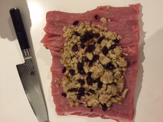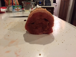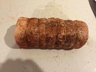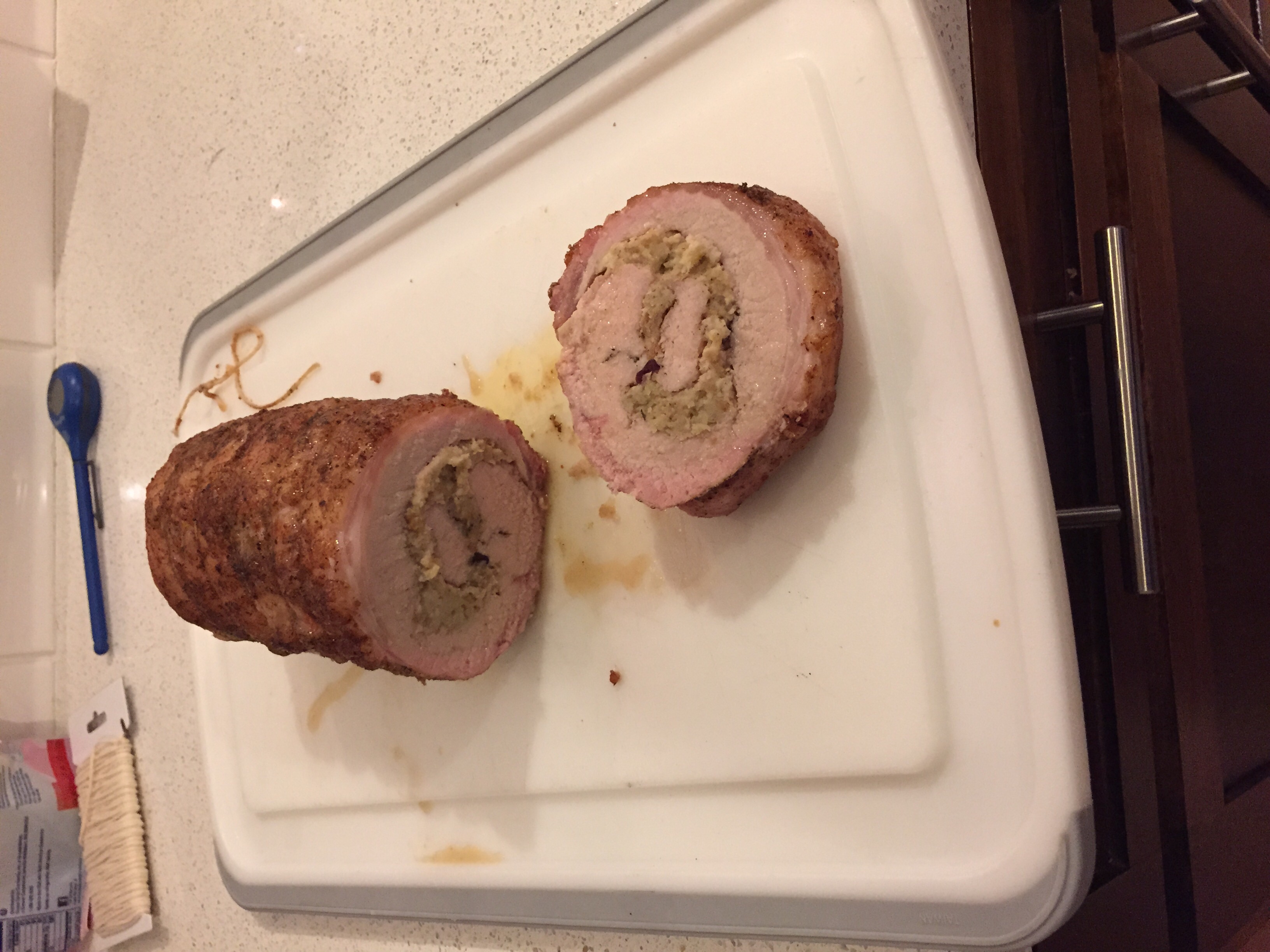 First post of 2015! I picked up this package from Costco yesterday. It looked like two loins tied together so I figured two is better than one......right? Cut one open and started unrolling so I could stuff with cranberries and bread stuffing. Coated the outsize with down and dizzy. Going indirect and raised at 325 until we hit 145. I'll save the other one for chops next week. It's raining in Dallas so I MaGyver'd a rain rood.