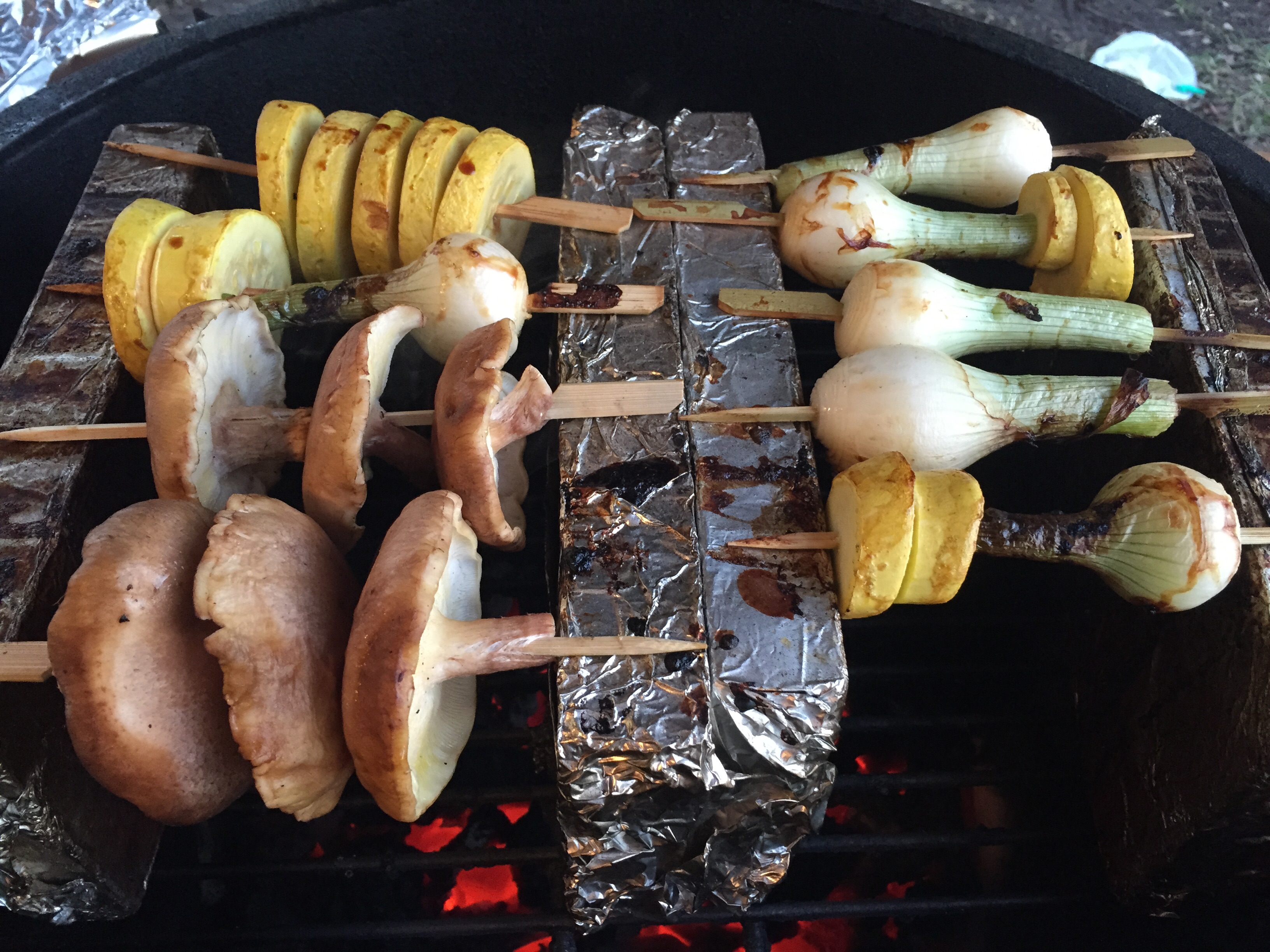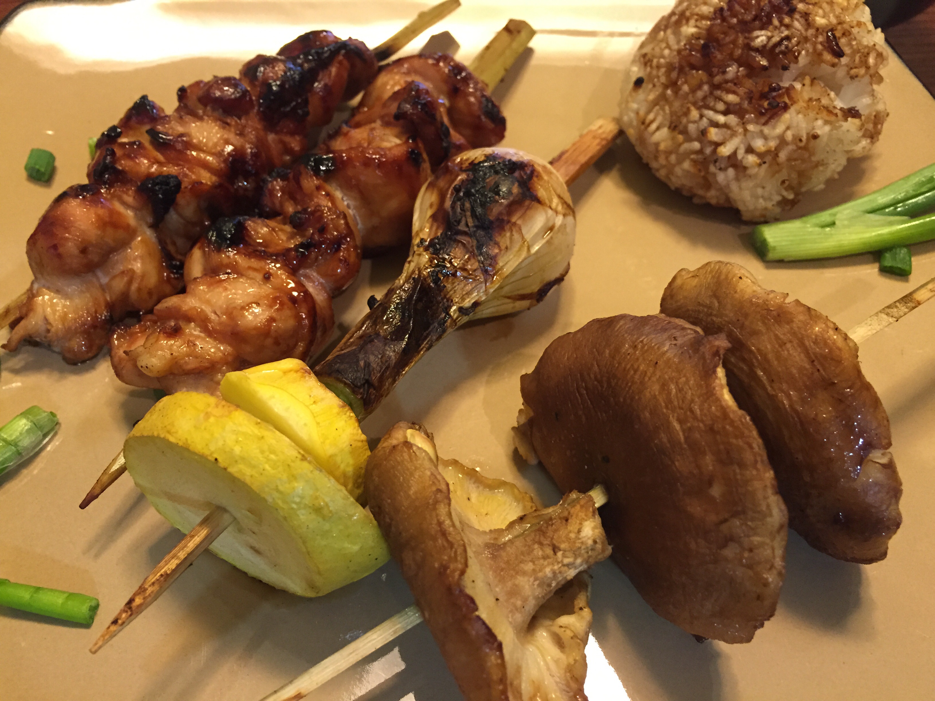 Yaki tori, yaki onigiri, shiitake mushrooms, squash, and those strange big bulb scallions that are so tasty.