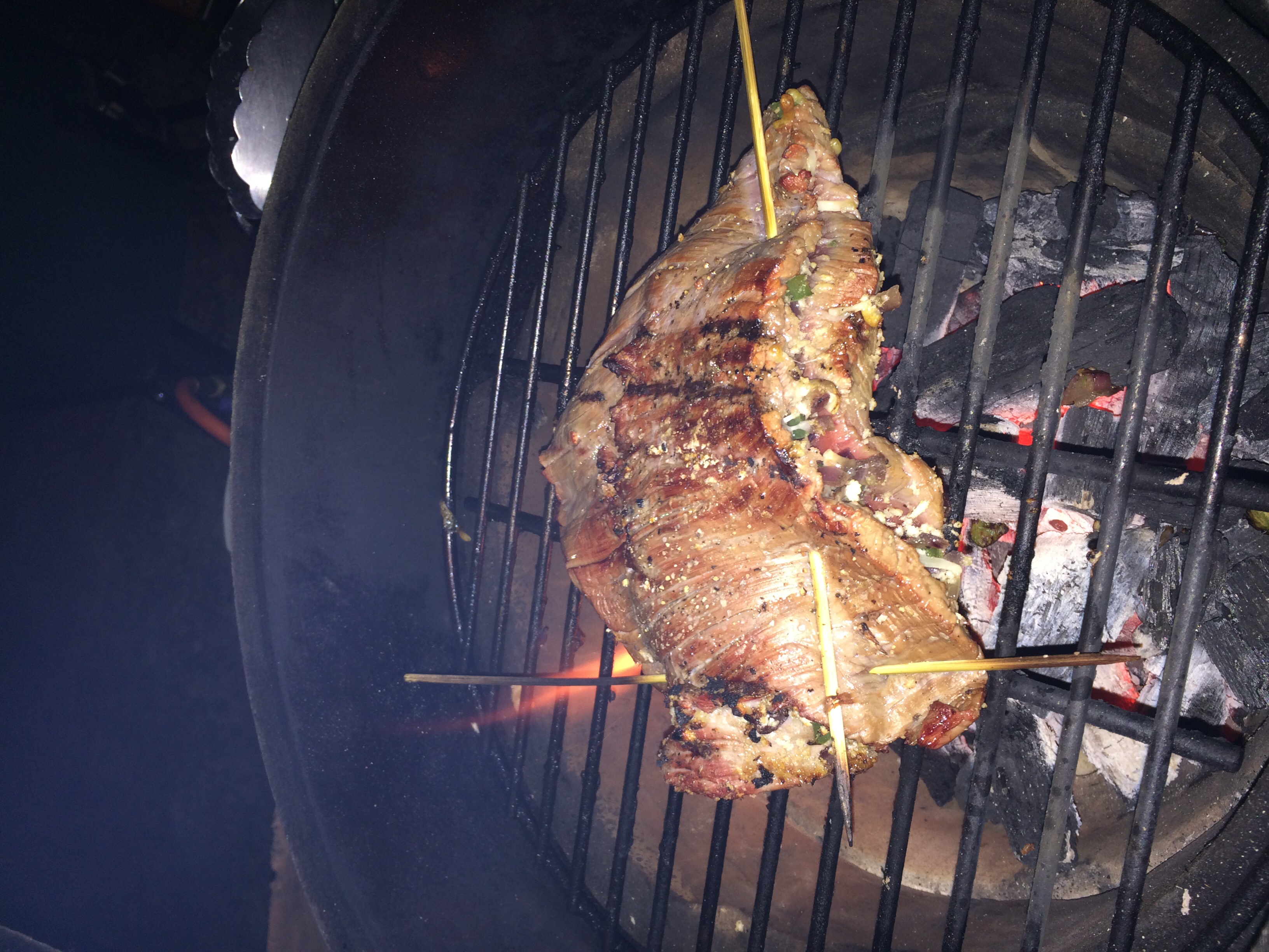 I attempted to butterfly the flank steak and then stuffed with the sautéed onion/bell pepper/mushroom mix. Topped with some panko and shredded cheese. Used a couple skewers to hold it all together