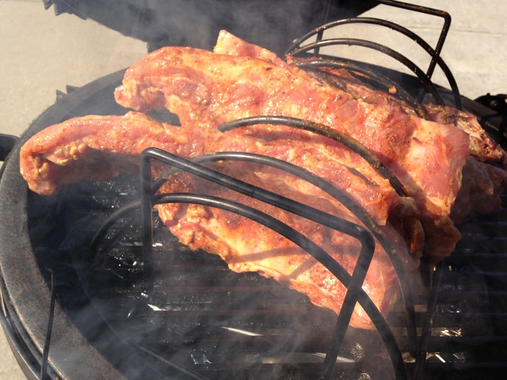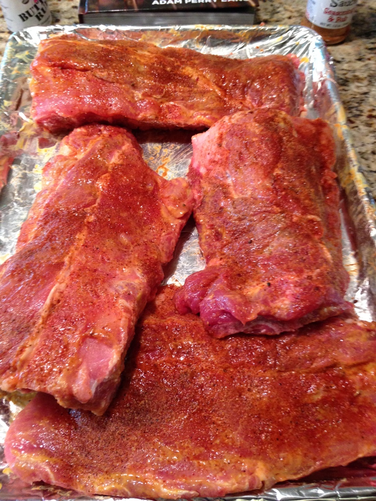 My first cook post on the Forum: baby back ribs!  Used  Adam Perry Lang's book as a guide.  Mustard, Worcestershire, and apple cider vinegar base coat with combo Bone Suckin' Sauce and Bad Byron's Rub put on thick.  Apple wood (4 chunks) mixed with a little hickory (2 small chunks) and BGE set at 250 using the Pitmaster IQ120 to regulate temp.  IQ set at 200 which kept the dome temp at 250.  Smoked for around 3+ hours, removed and foiled with a combo of honey, apple juice, and brown sugar.  Increased temp to 275, stacked foil packs on the egg and cooked for another hour flipping half way through.  Removed from foil and dusted with a little more rub and put back on for another 30 minutes to firm up.  Removed plate setter and then basted ribs with a little Sweet Baby Ray's every 10-15 minutes for another 30 minutes.  Removed and sliced up ribs for serving.  Overall very nice final result with good chew.  The honey and the applewood smoke come through strongly.  Next time I'll go lighter on the smoke and likely add another 30-60 minutes to the first stage of the cook to get more pullback from the bone (meaning start the cook earlier in the day so as not to run out of time).  I was tight on time as most of the ribs were going to a friend's house and dinner time snuck up on me.  Enjoy!